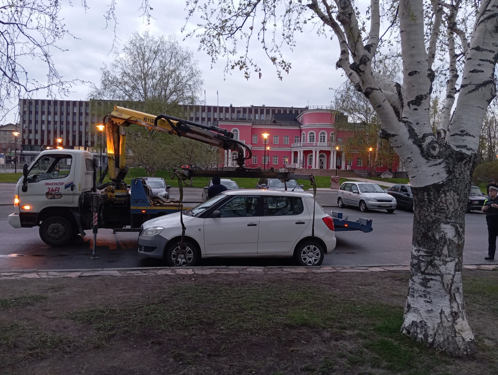 Автомобили, припаркованные с нарушением правил, эвакуируют вечером 25 мая с набережной Петрозаводска, напротив здания городского ЗАКСа на Еремеева, 1.