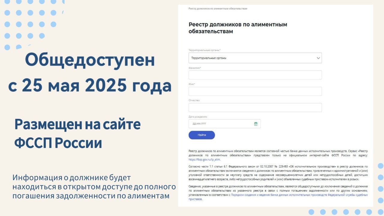 Реестр должников по алиментам сделали общедоступным с 25 мая 2025 года. Об этом сообщили в пресс-службе .