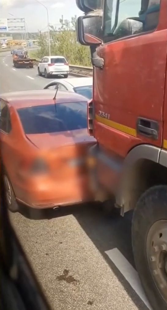 Судя по кадрам с места события, грузовоз врезался в один из легковых автомобилей. Еще несколько машин, попавших на видео, точно так же помяты сзади.