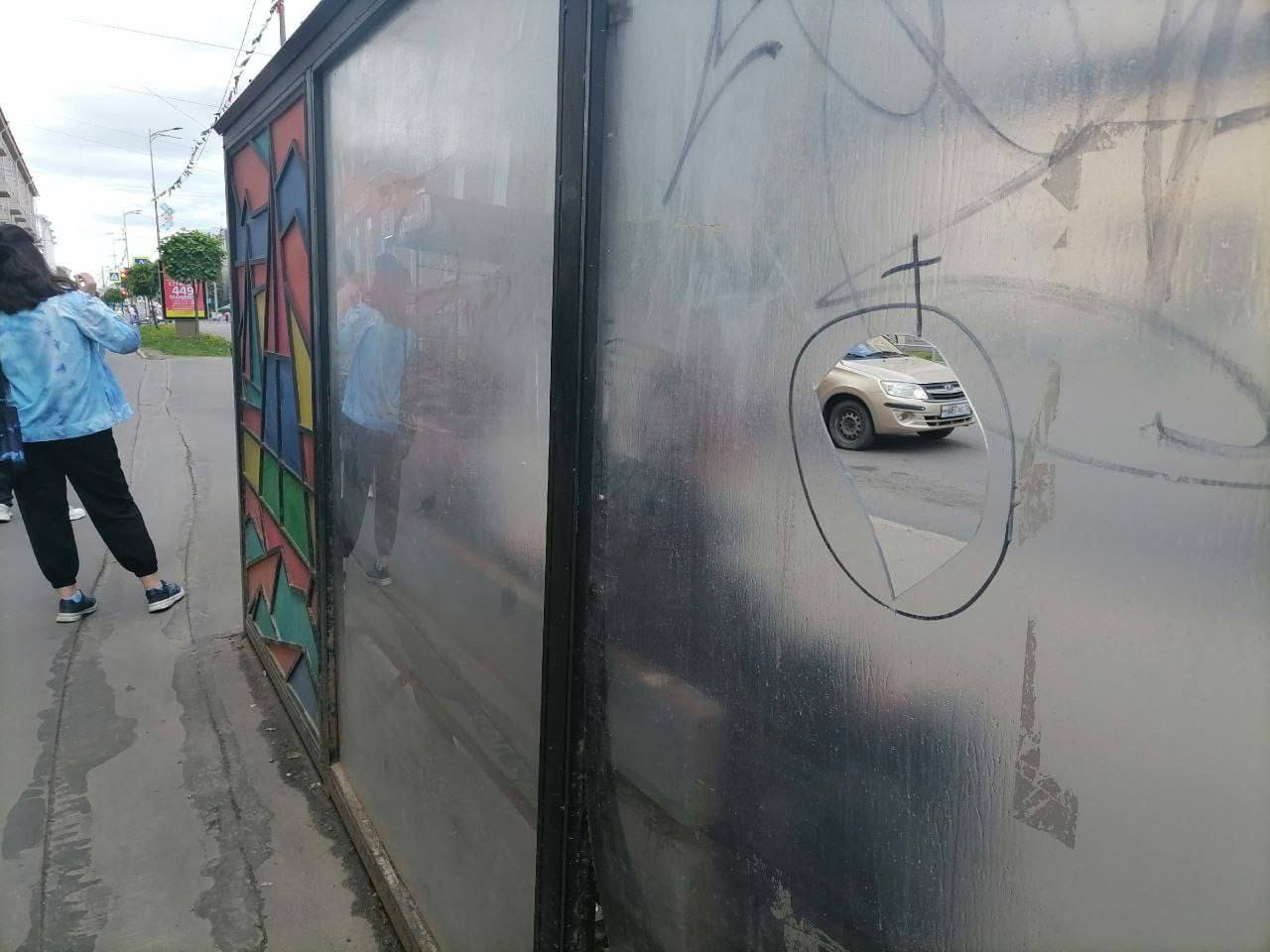 На проспекте Ленина испортили новую стильную остановку с витражами. Какой-то хулиган продырявил обшивку ножом или чем-то острым. Теперь всю повреждённую часть придётся менять — деньги на ветер.