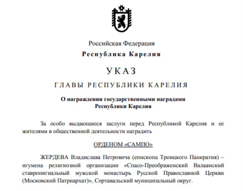Глава Карелии Артур Парфенчиков вручил игумену Панкратию, в миру — Владиславу Жердеву, республиканской орден «Сампо». Официальный указ опубликован на сайте правовых актов Карелии.