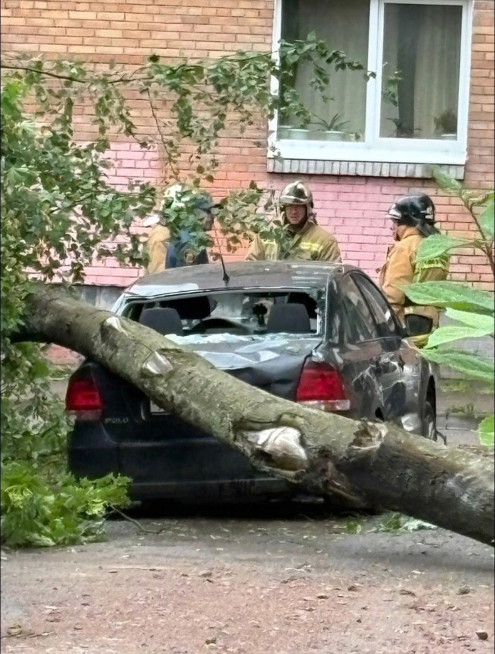 Также упавшее дерево разбило припаркованную рядом машину. На месте работают экстренные службы.