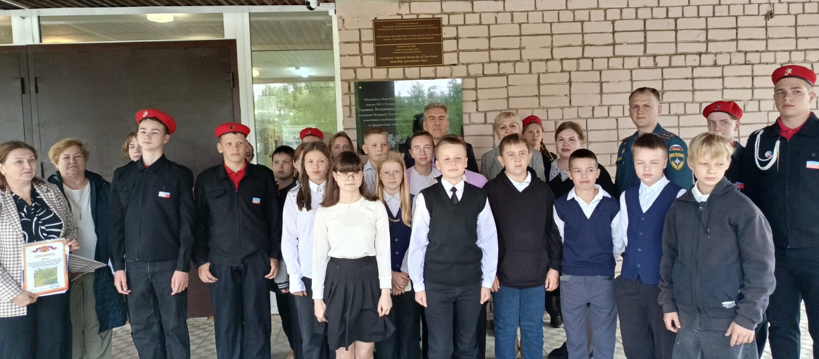Минутой молчания все присутствующие почтили память всех героев, участников Великой Отечественной войны, всех воинов, сражавшихся за нашу Родину. Право открыть мемориальную доску было предоставлено Маргарите Прохоровой и Анне Фадеевой.