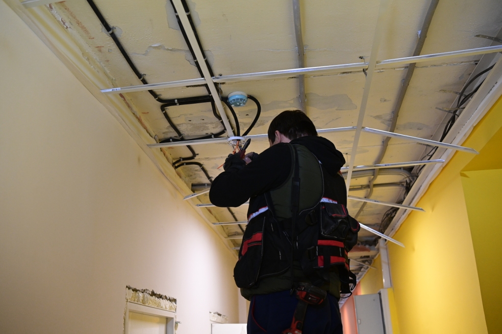 На здании уже обновили фасад, в нем полностью заменили окна. Сейчас в школе укладывают плитку, окрашивают стены, монтируют светильники, ремонтируют систему пожарной безопасности.