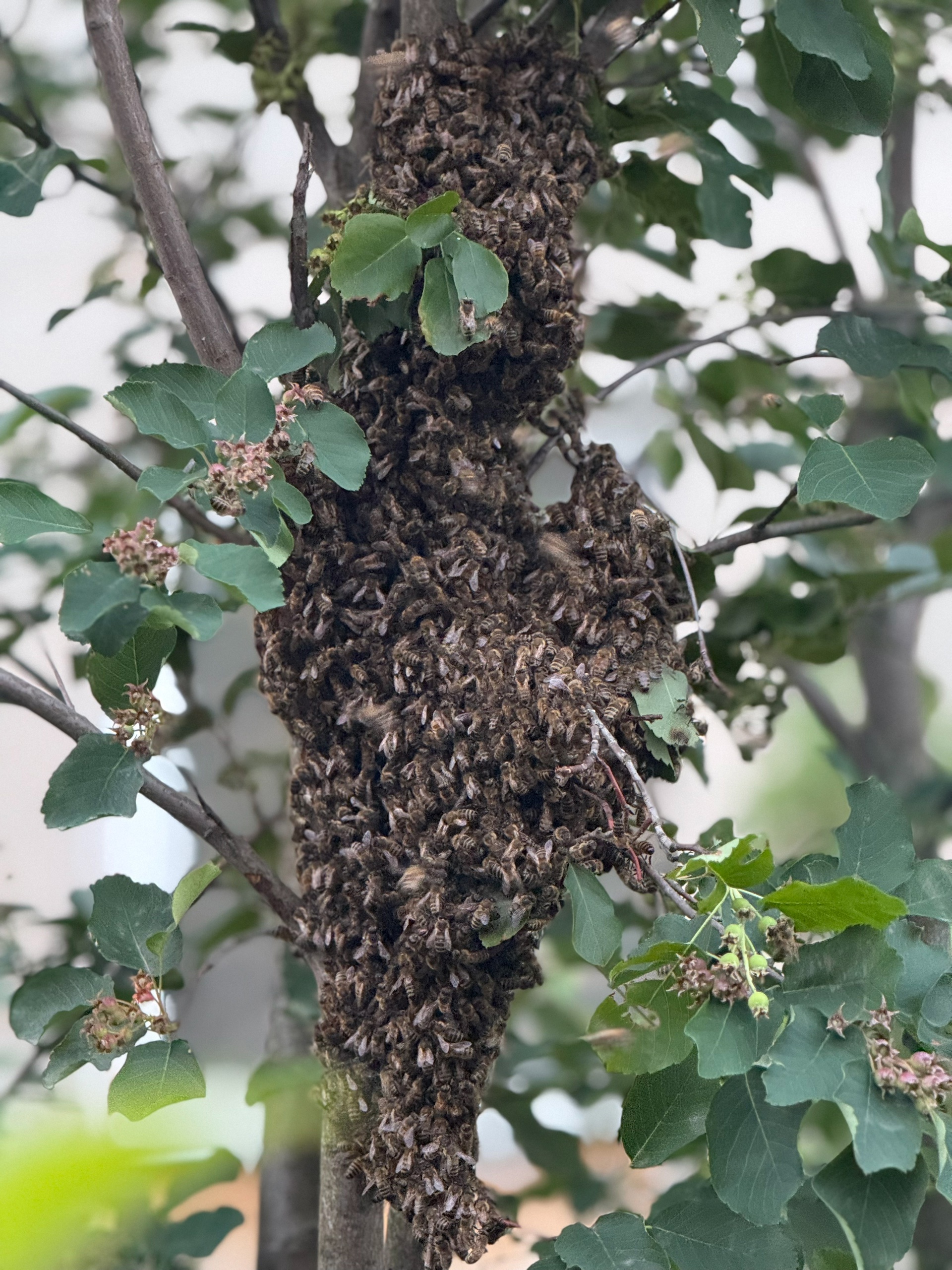 Пчеловод поймал рой с помощью специального устройства. Оставшиеся пчелы, по его словам, будут ночевать в цветах.