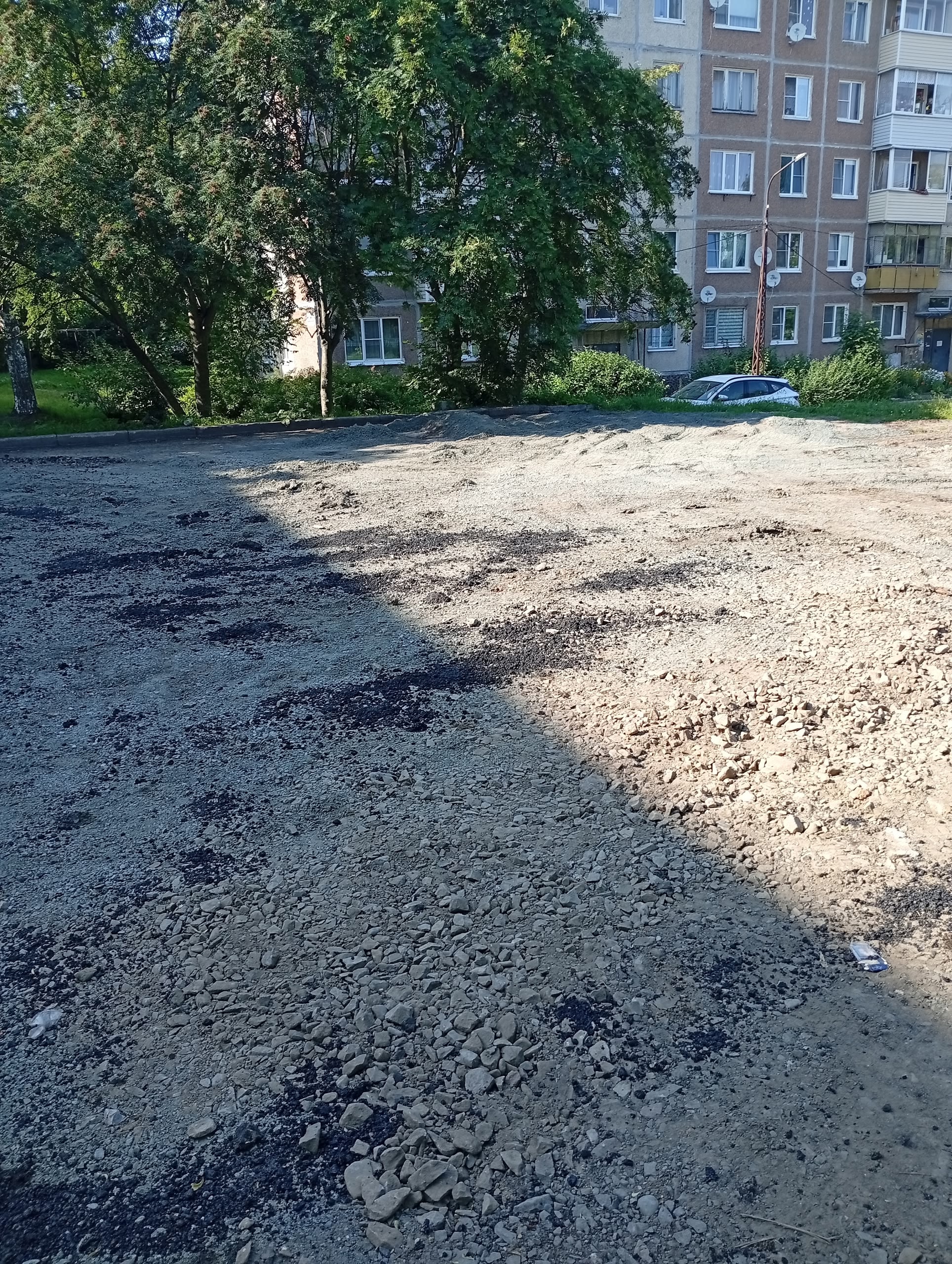Теперь отремонтированный участок находится выше неотремонтированного, что приведёт к постоянному стоку воды и быстрому разрушению нового покрытия. После работ остались разбросанный щебень и строительный мусор, а старое покрытие с неотремонтированной части и вовсе сняли.