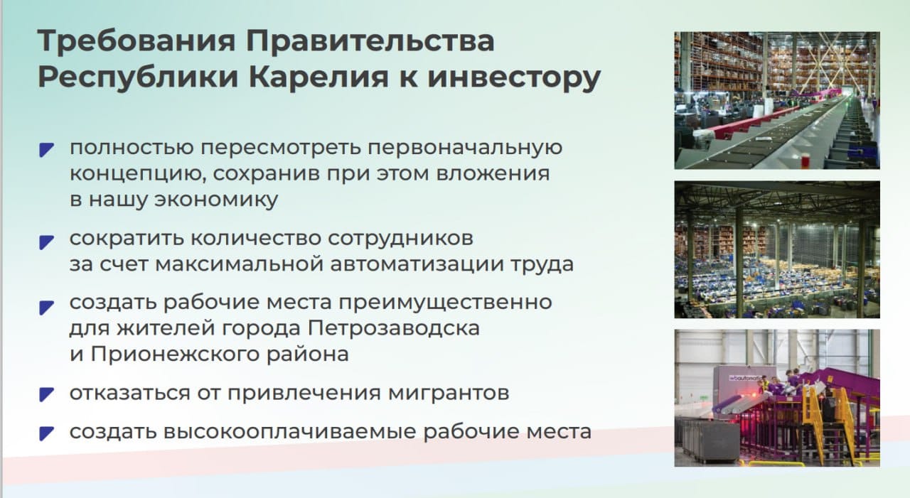 Среди условий, на которые готово согласиться руководство компании ради возможности работать в Карелии, — сокращение числа сотрудников в три раза, отказ от найма мигрантов, высокий уровень автоматизации и достойная оплата труда