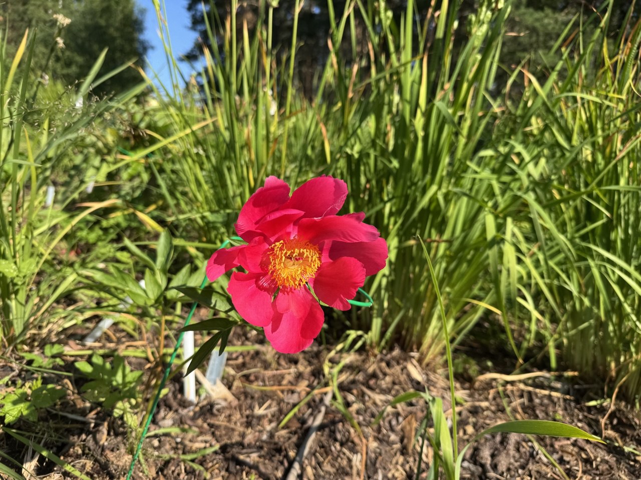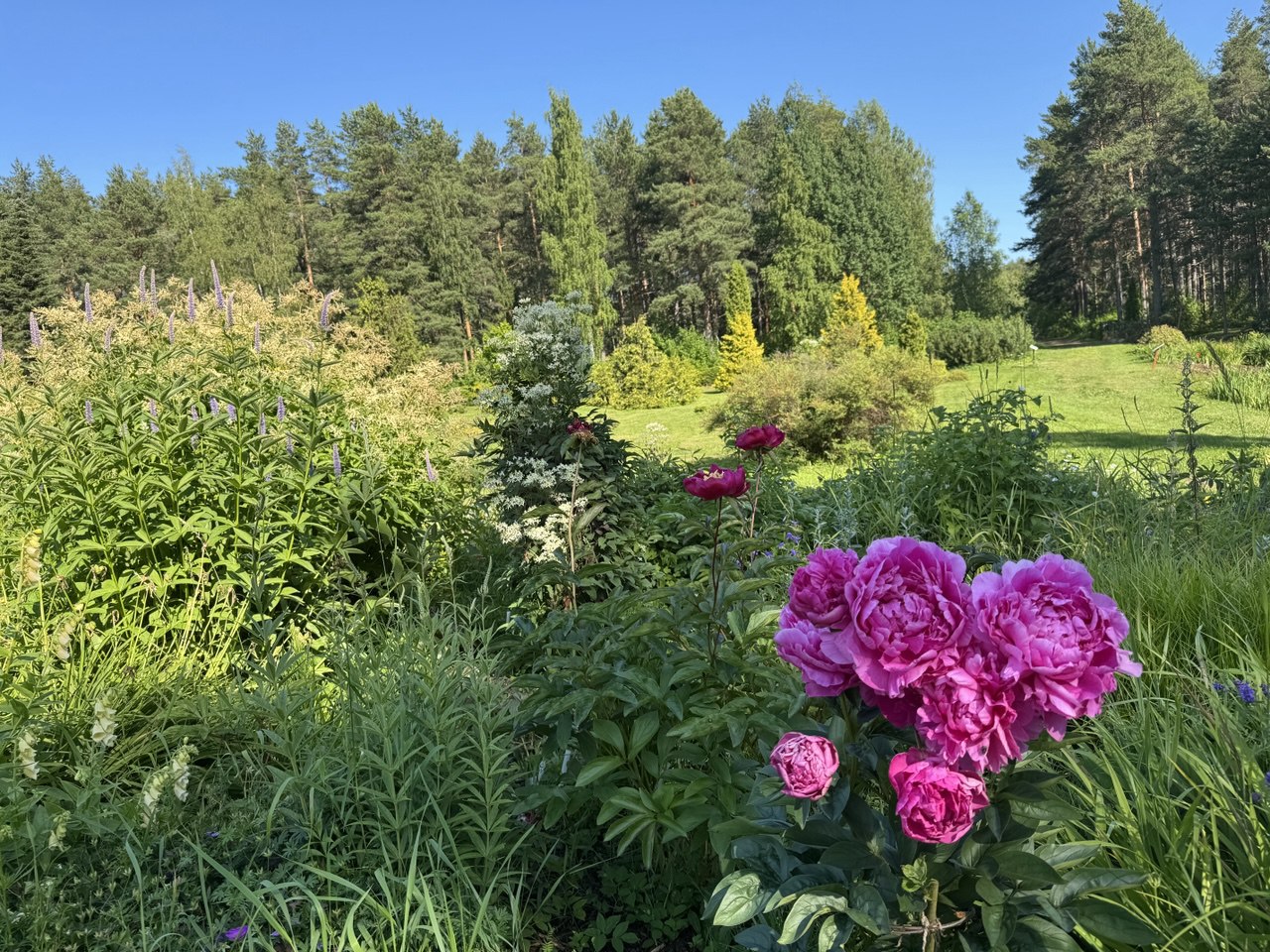 Пруд в саду практически высох из-за жаркой погоды, но зато вокруг него расцвели пионы и другие разнообразные цветы, названия которых знают только ботаники или любители декоративных растений.