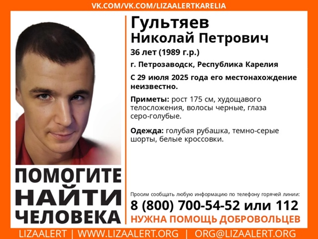 Мужчина пропал 29 июля в Петрозаводске. С тех пор его местонахождение неизвестно.