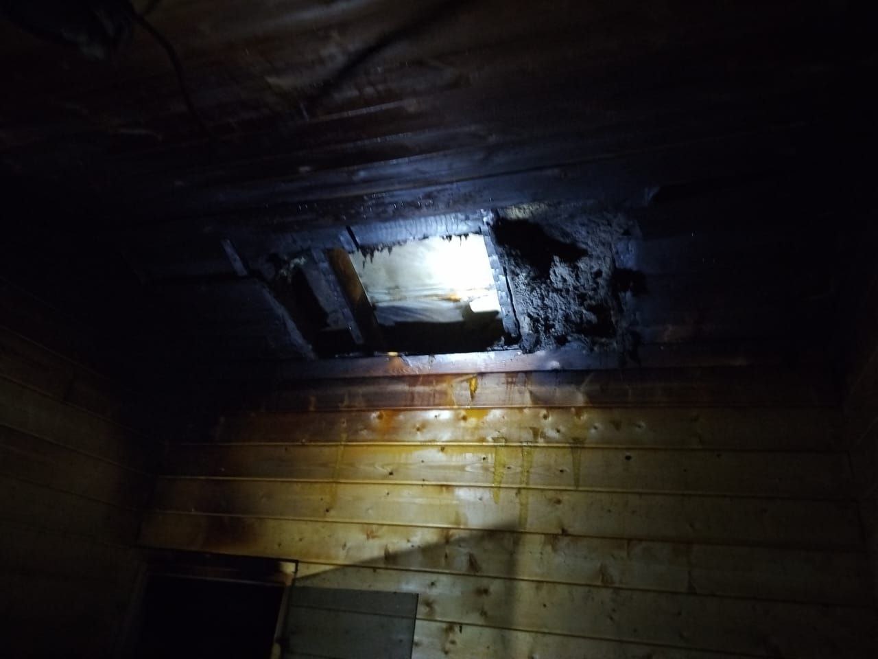 По информации ведомства, в 23.05 пожар ликвидирован на площади 10 кв.м. Судя по кадрам, огонь сильно повредил строение. Пострадавших нет.
