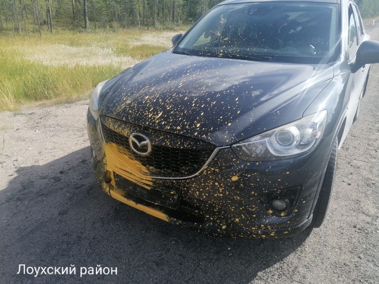 После столкновения автомобилей разлилась краска, чем повредило легковой автомобиль «Mazda CX-5», движущийся во встречном направлении.