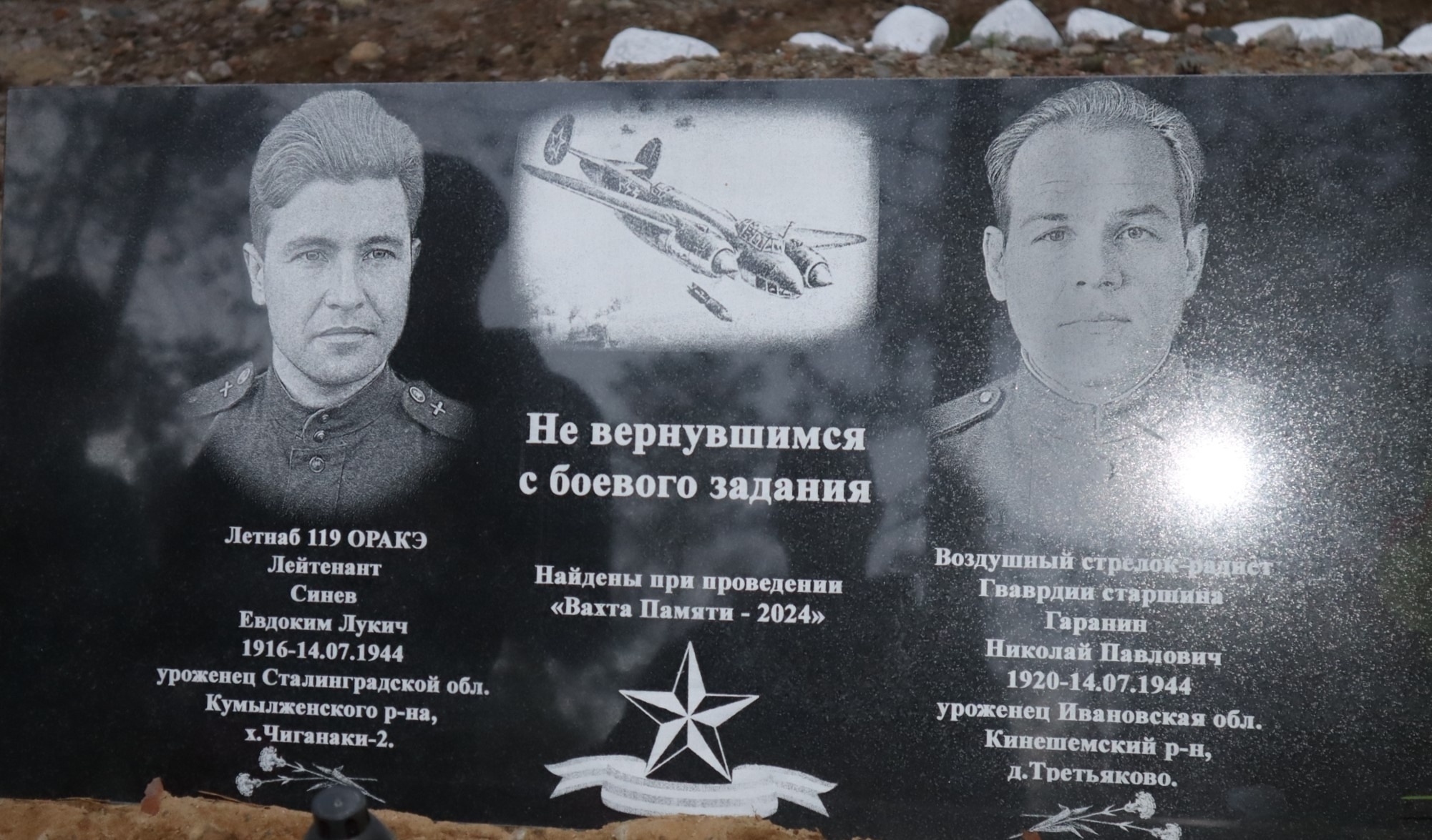 15 августа 2025 года на мемориале у озера Колласъярви установили памятную плиту с именами Синёва и Гаранина. Родственники взяли с места падения самолета землю и фрагменты фюзеляжа. Ирина планирует передать часть находок в школу поселка Чиганаки, где родился ее прадед.