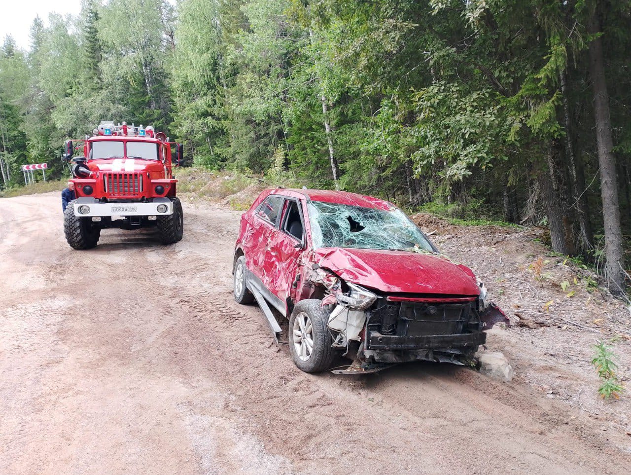 Спасатели осмотрели место ДТП, отключили аккумуляторную батарею и смыли ГСМ. На месте работали сотрудники скорой медицинской помощи и дорожные полицейские. Пострадавший доставлен в Суоярвскую ЦРБ.