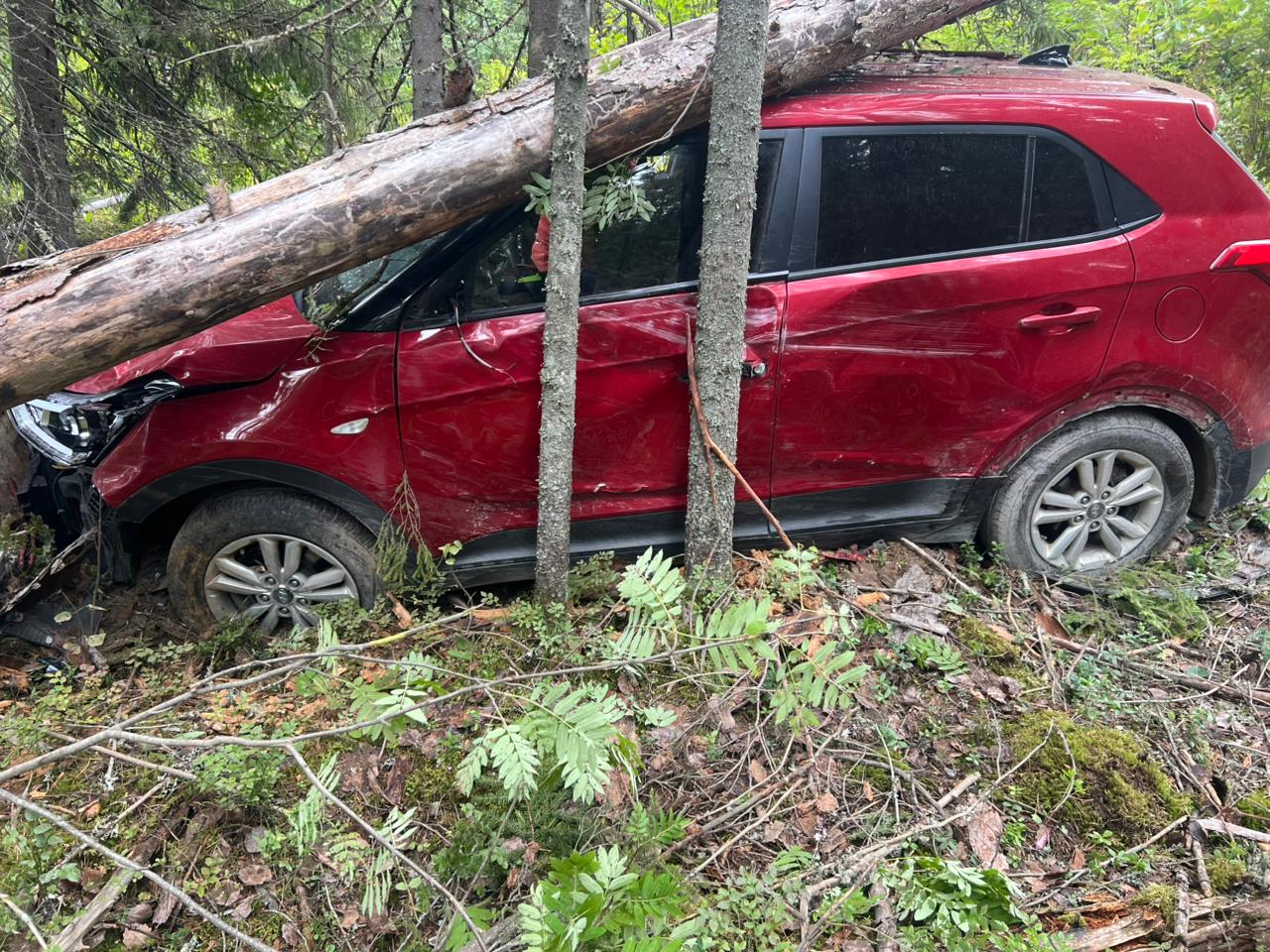 Авария случилась в минувший вторник, 19 августа, около 10 часов утра, на 74 километре автодороги «Суоярви – Юстозеро (через Поросозеро) – Медвежьегорск». Там водитель Hyundai Creta при прохождении сложного участка дороги съехал в кювет. Там иномарка столкнулась с деревом.