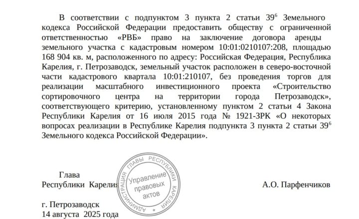 «…предоставить обществу с ограниченной ответственностью «РВБ» право на заключение договора аренды земельного участка с кадастровым номером 10:01:0210107:208, площадью 168 904 кв. м, расположенного по адресу: Российская Федерация, Республика Карелия, г. Петрозаводск, земельный участок расположен в северо-восточной части кадастрового квартала 10:01:210107, без проведения торгов для реализации масштабного инвестиционного проекта «Строительство сортировочного центра на территории города Петрозаводск…»,- гласит текст распоряжения.