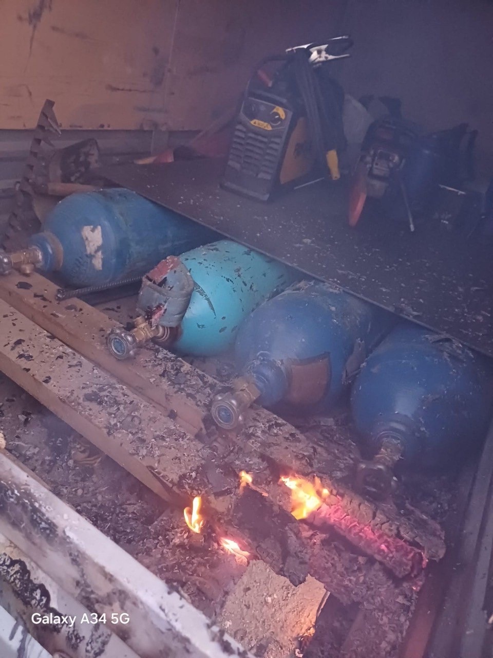 На место происшествия прибыли 5 пожарных на 2 автоцистернах. Огнеборцы стали тушить горящий прицеп. Потом в прицепе были обнаружены кислородные баллоны и , бензоинструмент.