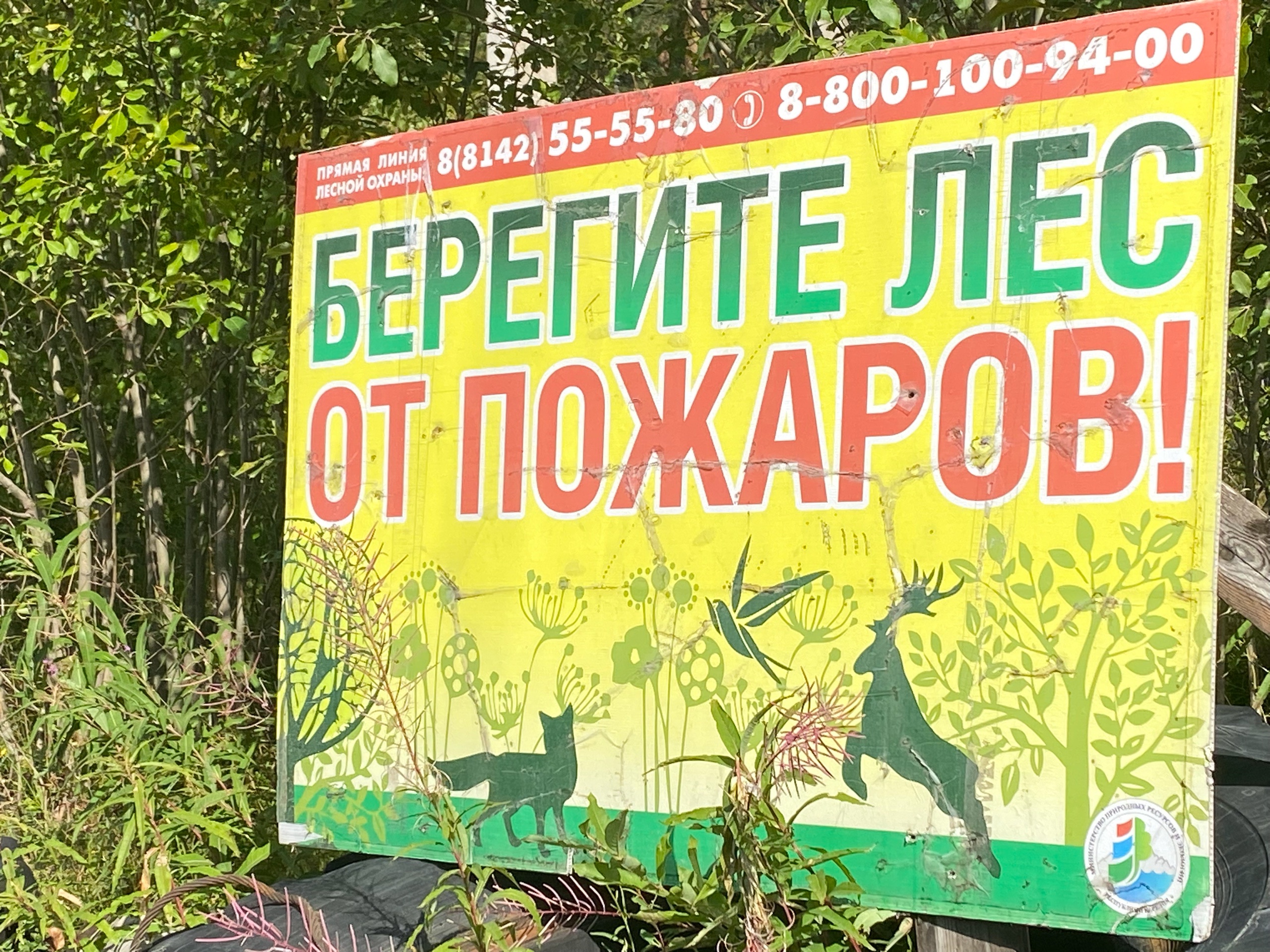 На одном из кадров — плакат с призывом беречь лес от пожаров.