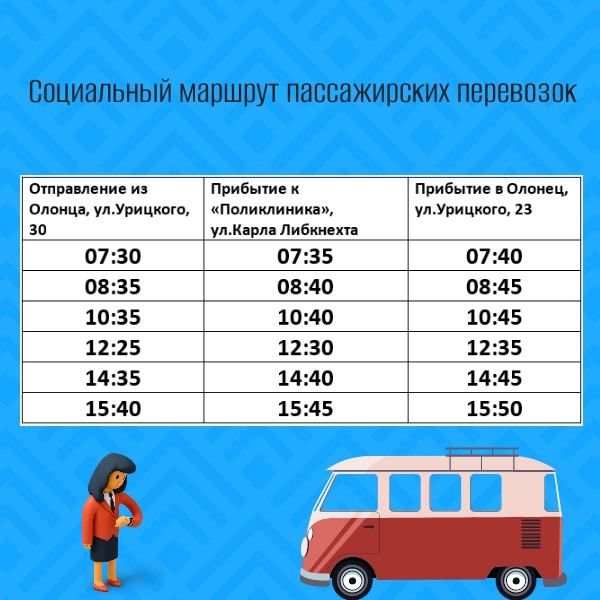 На срок проведения восстановительных работ «Больничного» моста от ул. Речная до ул. Карла Либкнехта г. Олонца, с первого сентября администрация запускает социальный маршрут пассажирских перевозок.
