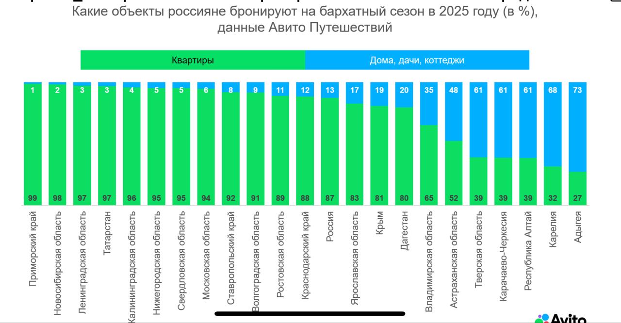 «За год доля бронирований загородных объектов на бархатный сезон увеличилась — если в 2024-м она составляла 9%, то в этом году выросла до 13%. И хотя посуточных квартир в среднем по стране бронируют на осень больше, есть регионы, в которых путешественники предпочитают для отдыха дома. В Адыгее, Карелии, Республике Алтай, Карачаево-Черкесии и Тверской области их популярность в бархатный сезон выше. При этом в другое время года цифры могут отличаться — влияние сезонных факторов на колебание спроса в загородном сегменте выше», — прокомментировал Артем Кромочкин, директор Авито Путешествий.