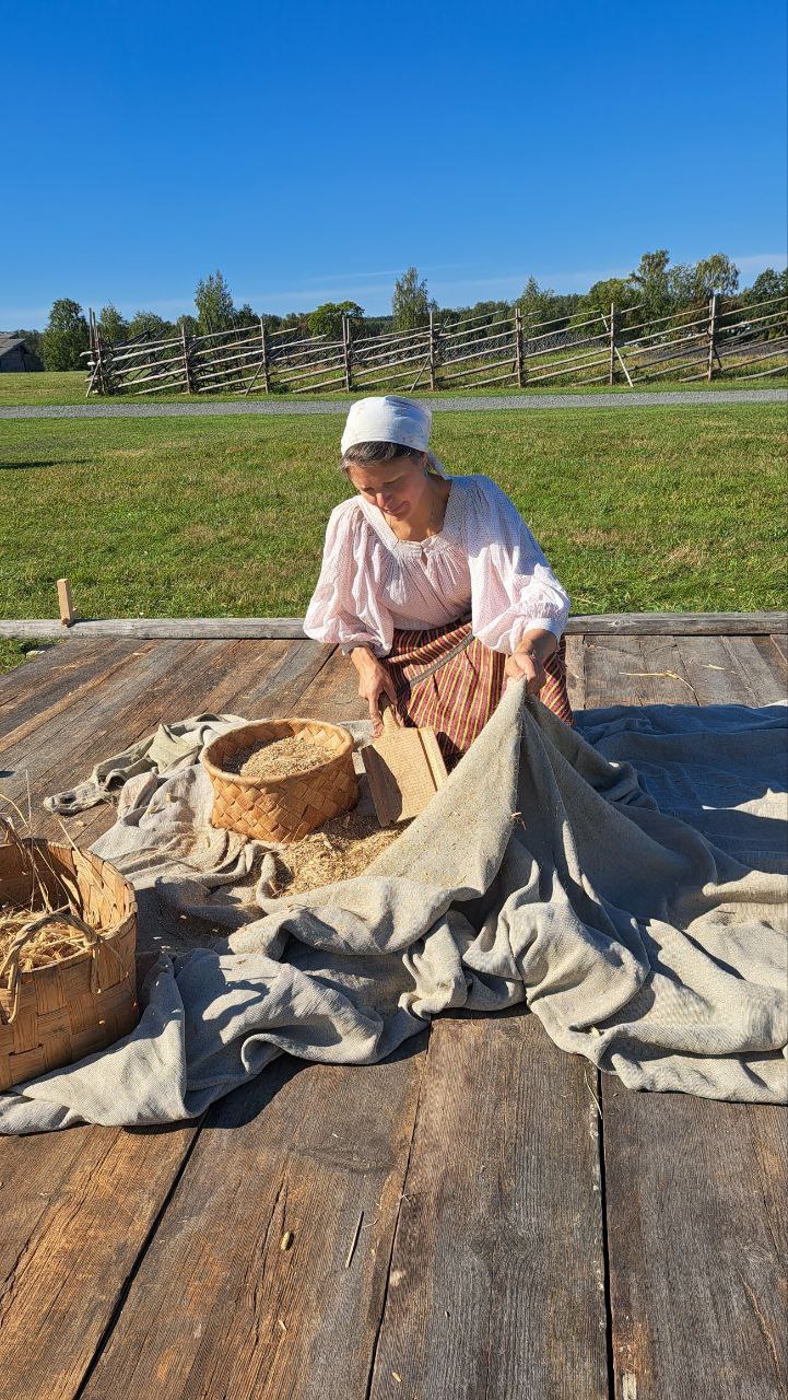 Музей приглашает посетителей наблюдать за процессом традиционной молотьбы и пробовать свежую выпечку в кафе на острове.