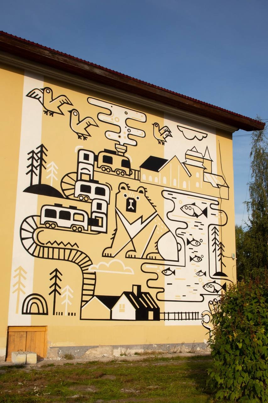 Фасад здания Медвежьегорского городского центра культуры и досуга расписали участники фестиваля муралов «Полоса отвода». Проект реализуют в рамках программы «Регион для молодых» нацпроекта «Молодёжь и дети». Мурал выполнили в минималистичном стиле. Художники визуально интерпретировали историю и культуру Медвежьегорска, изобразив в композиции узнаваемые символы города — медведь, рыбы, голуби, железная дорога и здание вокзала.