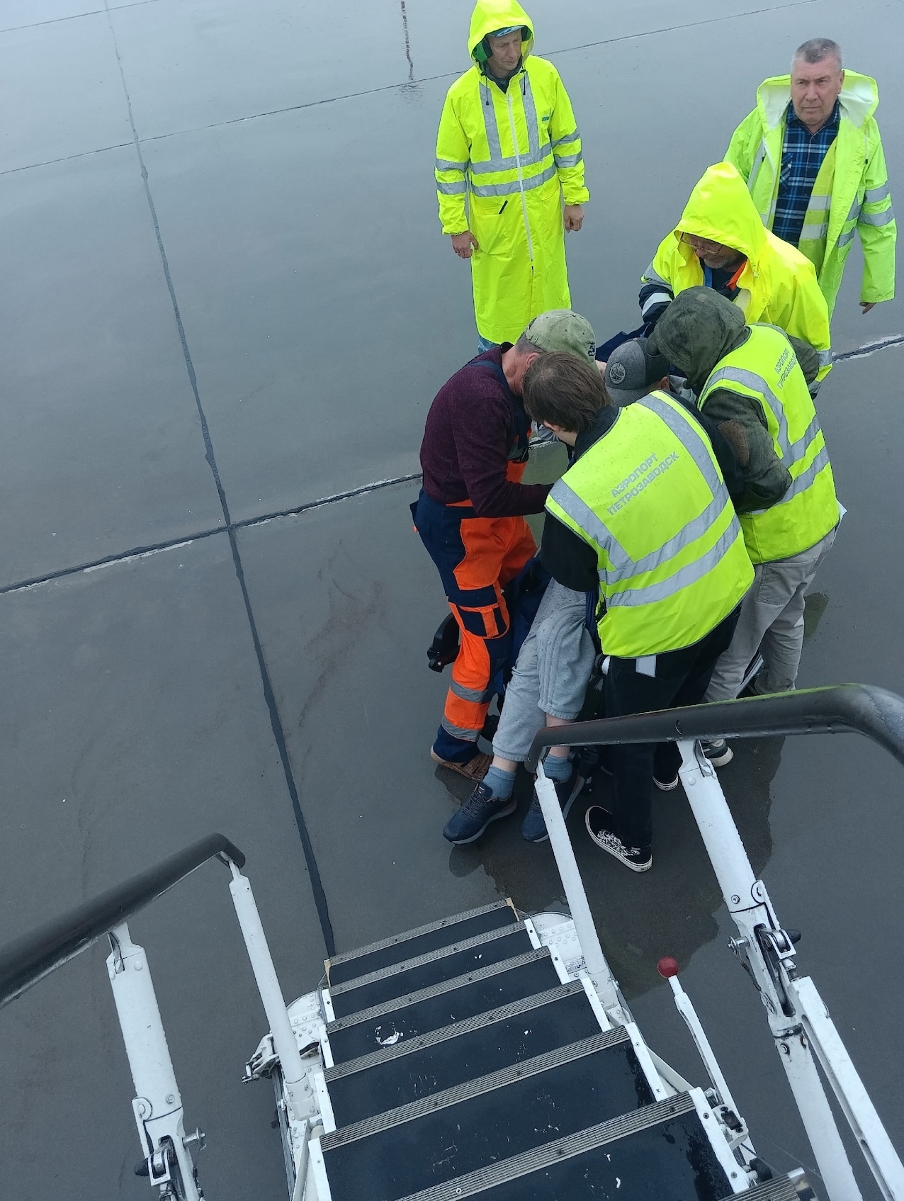 «… прилетев в субботу 20 сентября из Москвы, нас просто «убила» помощь инвалиду. Прикладываю фото. Сначала инвалида кладут на пол на мягкие носилки, волокут до выхода. Потом решают, что делать дальше! Как по трапу спуститься? Он очень узкий. Спустились. С горем пополам посадили в кресло. Шёл дождь. Не дождик! Кресло стояло на улице ещё до прилёта самолёта. В нашем аэропорту есть шагоход. Специальное сидение, которое шагает по трапу. Но оно сломано. Сломалось не вчера. Мы улетали 24 августа. Уже было сломано. А по разговорам, он был сломано уже давно. Кто виноват? Напишу руководителю. Ответит: денег нет», — пожаловалась Елена.