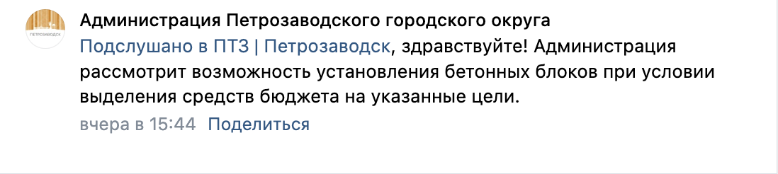 В качестве решения проблемы жительница предложила установить в проблемном месте блок или ограждение для ограничения проезда транспорта. По ее мнению, это предотвратит парковку на пешеходной зоне. На предложение местной жительницы в социальных сетях ответила Администрация Петрозаводского городского округа.
