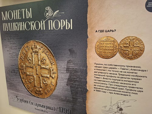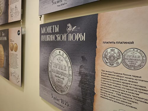На выставке представлены изображения старинных монет и ассигнаций, которые Пушкин и его современники держали в руках. Гости узнают о стоимости жизни в пушкинское время, увидят монеты-кольцевики и платиновые монеты, впервые появившиеся в России в XIX веке.
