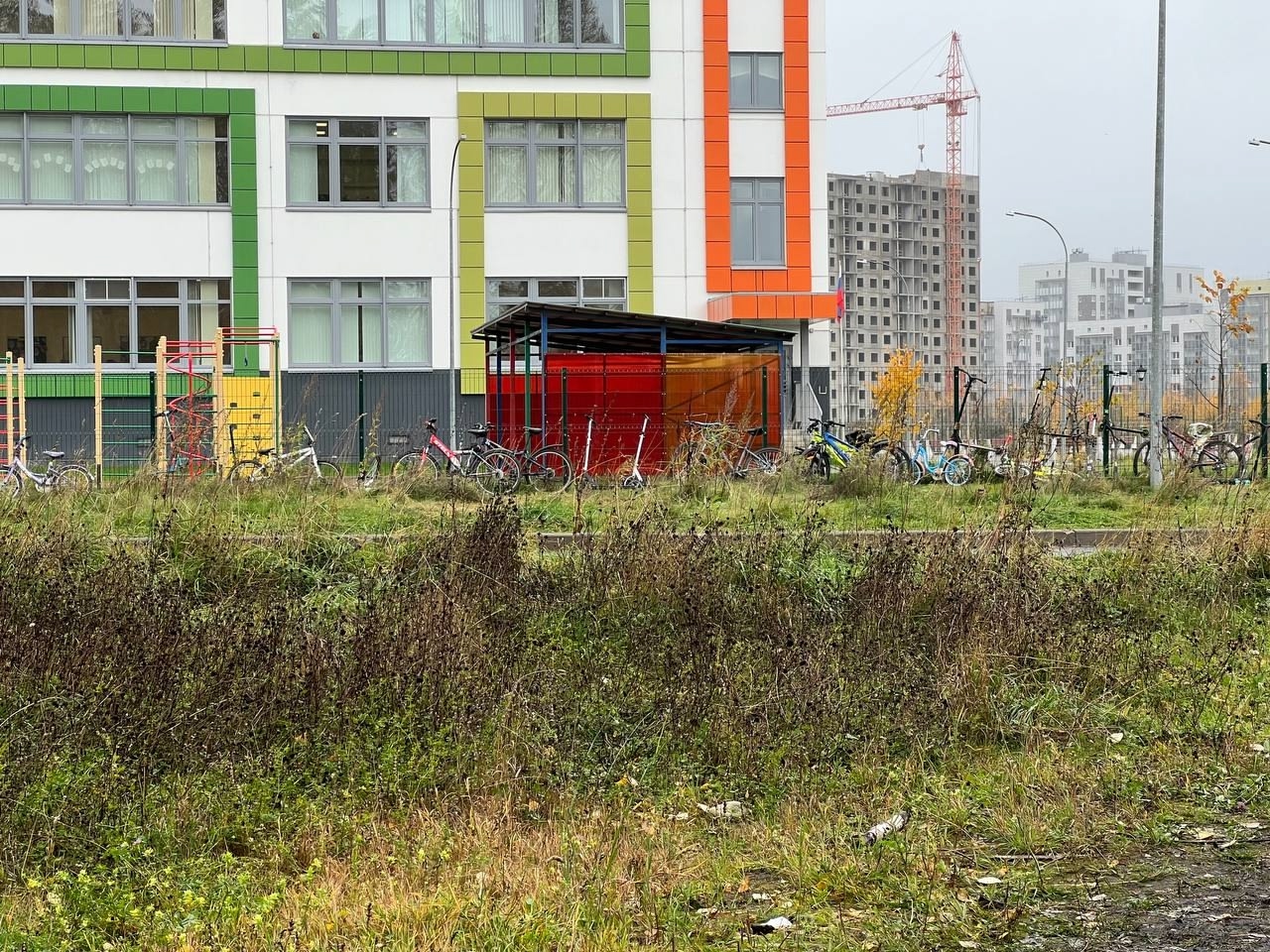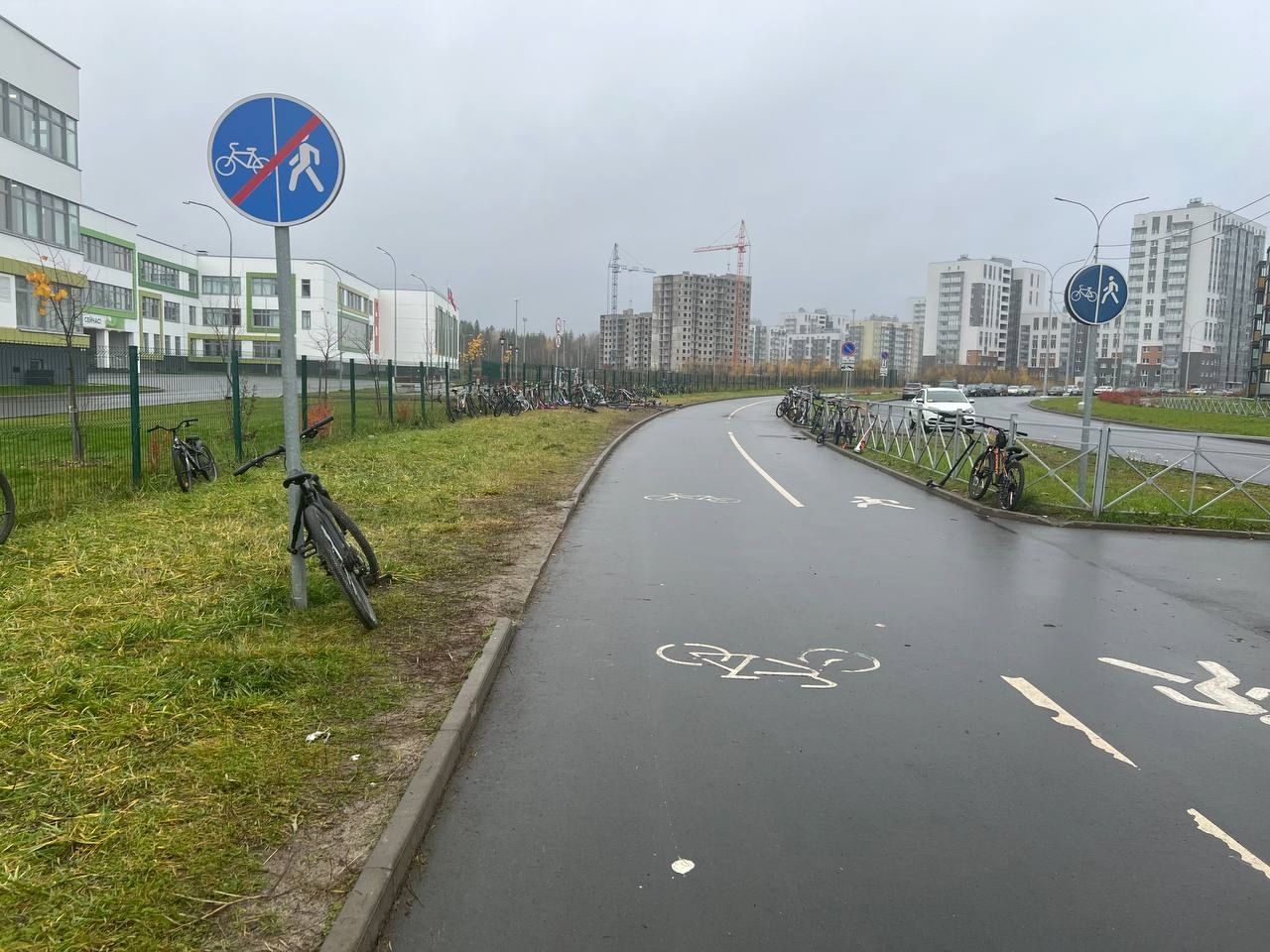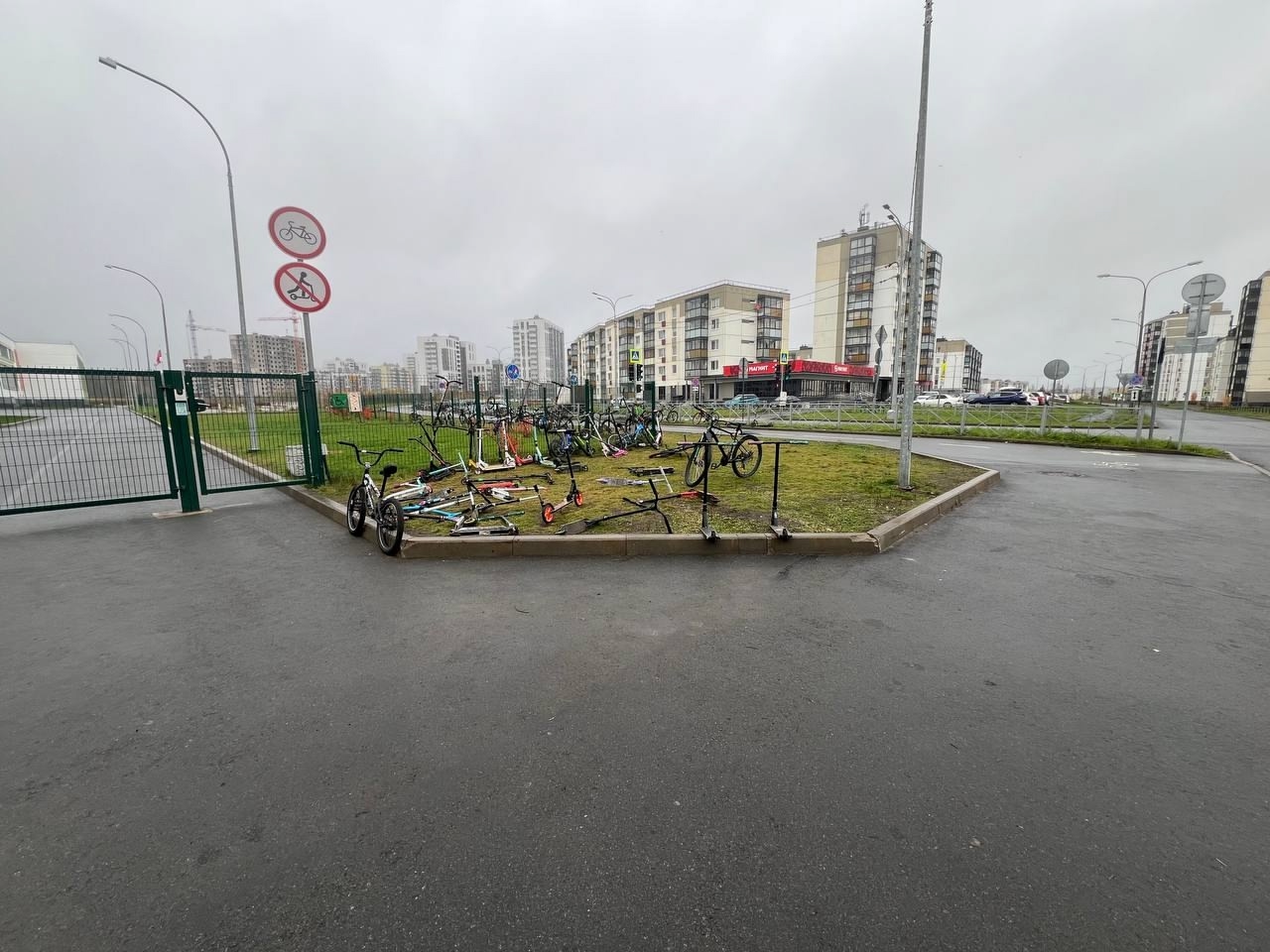Школа пообещала найти новое место для стоянки — но, как видно, дело дальше слов не пошло. Теперь велосипеды и самокаты разбросаны у входа, стоят в кучах и даже висят на школьном заборе.