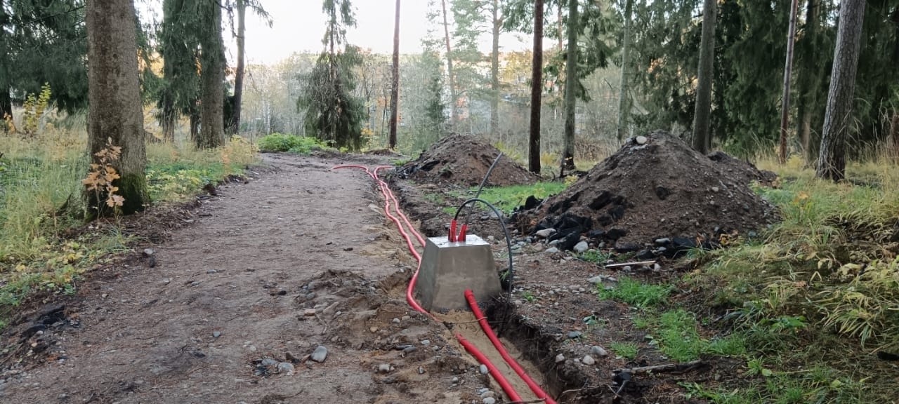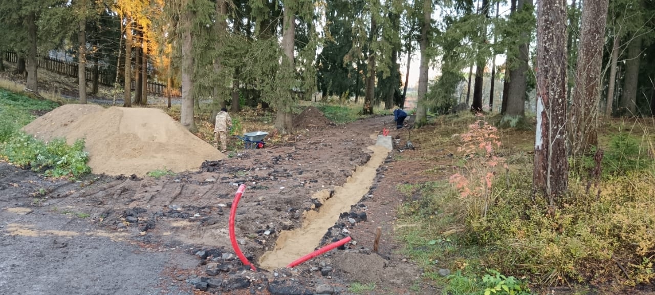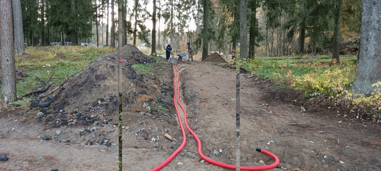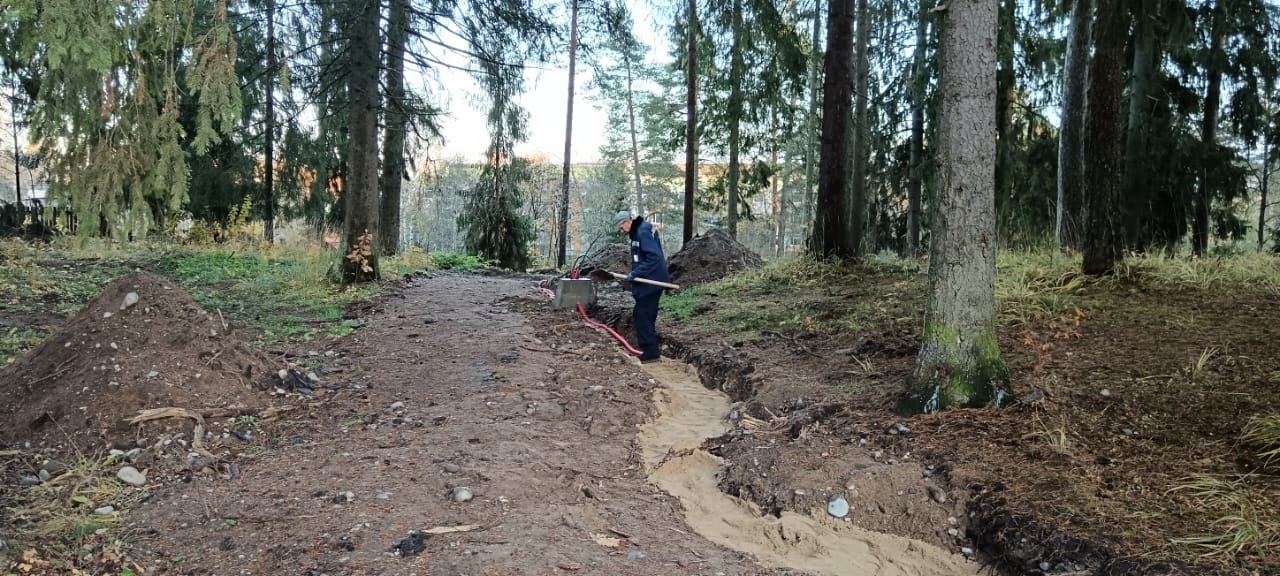 На территорию парка завезли материалы для новых дорожек. Одновременно началась прокладка кабеля для уличного освещения.