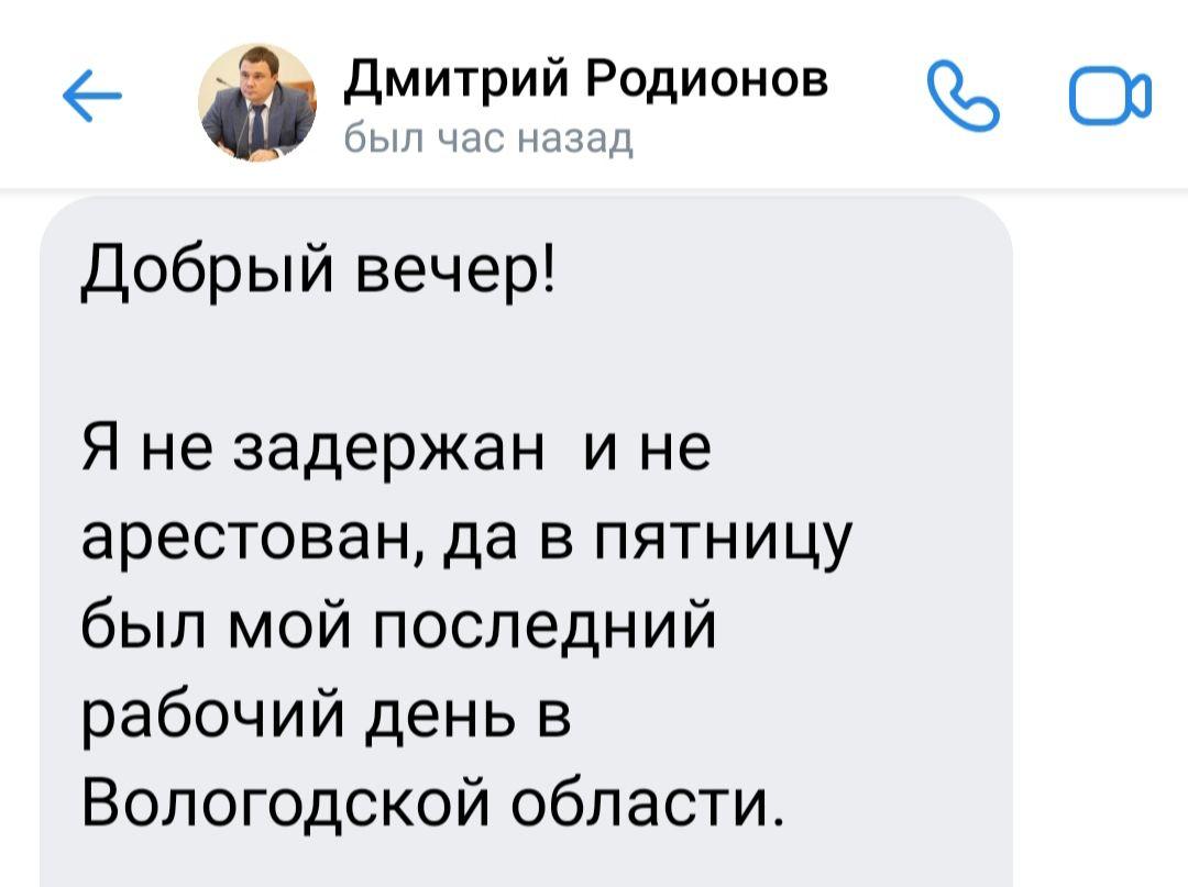 После этого Дмитрий Родионов опубликовал короткий пост, что он не задержан и не арестован.