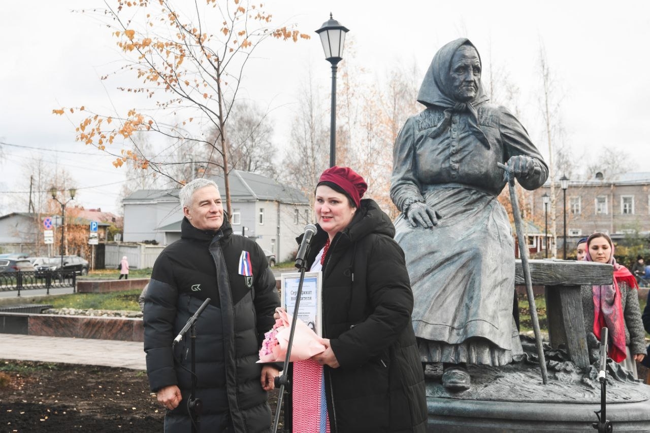 Артур Парфенчиков поблагодарил всех, кто участвовал в создании памятника и благоустройстве сквера. На церемонии открытия он вручил премию имени Федосовой детскому танцевальному коллективу «Заонежская задумка» из родных мест сказительницы.