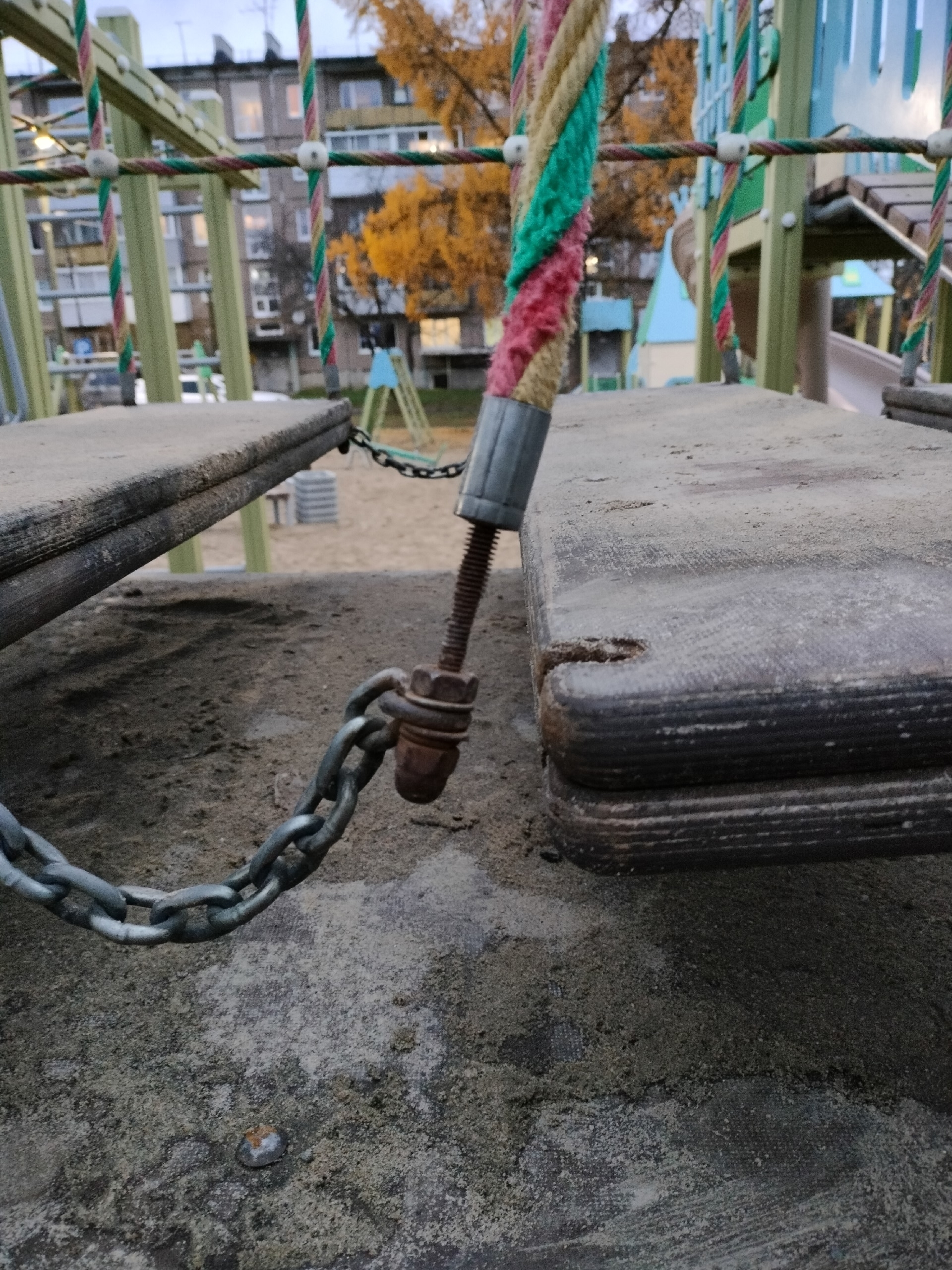 Кроме того, на площадке есть отвинченные болты и опасно торчат элементы детского городка. В некоторых местах отсутствуют ступени.