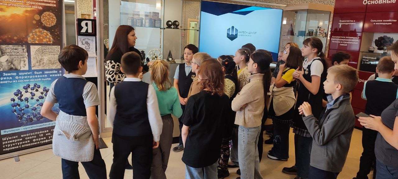 Во время визита детям показали полный цикл добычи шунгита и провели практический эксперимент. Сотрудница предприятия Оксана Петри наглядно продемонстрировала удивительные свойства минерала: его способность очищать воду от примесей, проводить тепло и блокировать электромагнитное излучение.