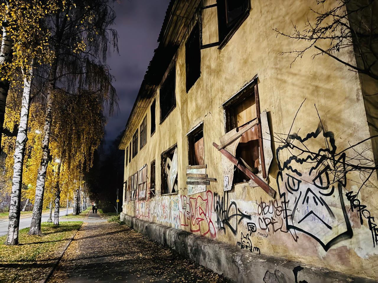 Следующая заброшка стоит на улице Коммунистов, 37, недалеко от Крестовоздвиженского собора и популярного в районе фитнес-клуба на Промышленной. Посетители фитнес-клуба — это в основном местная молодежь и индийские студенты, которые проживают в общежитии ПетрГУ на Промышленной. Ходить мимо этого здания вечером — сомнительное удовольствие. Стены исписаны, окна заколочены, но не везде.
