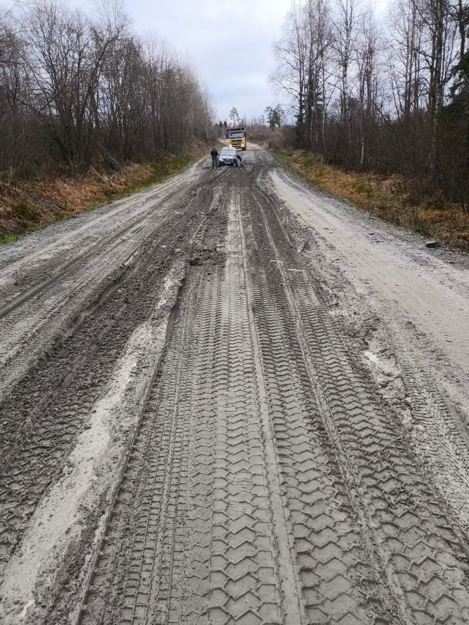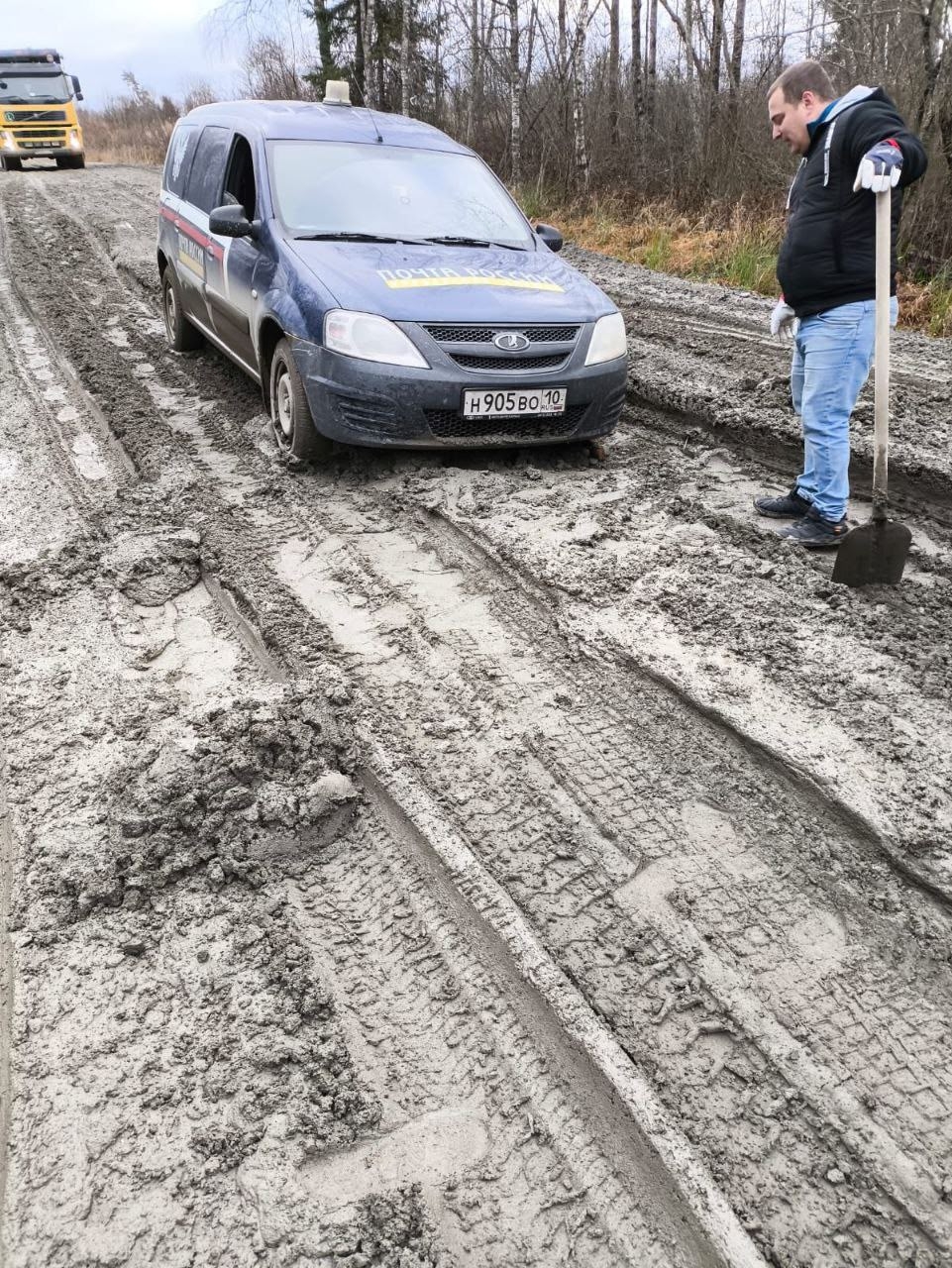 Сегодня, 14 ноября, машина Почты России застряла на дороге от поселка Вялимяки в сторону федеральной трассы, рассказали в сети.