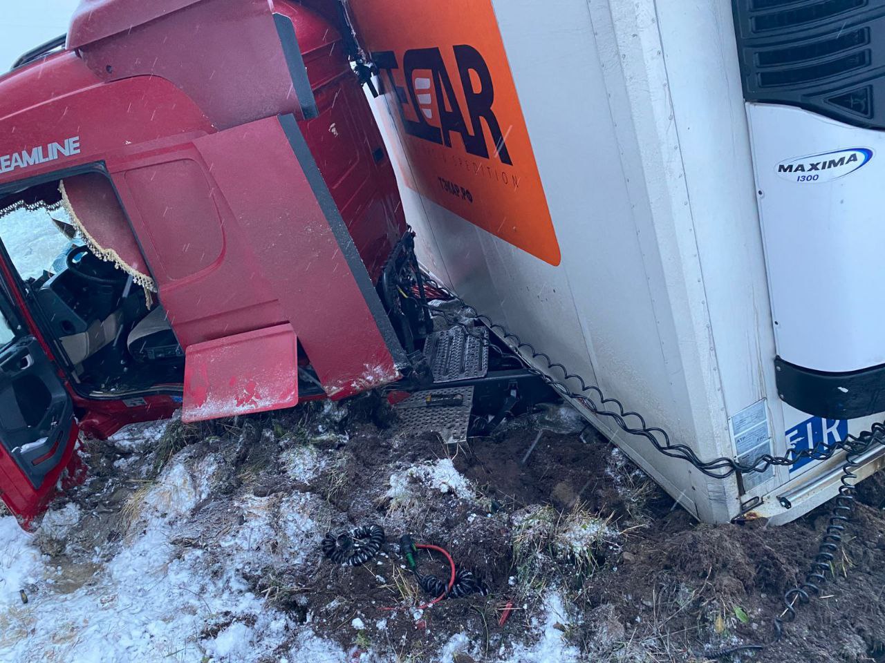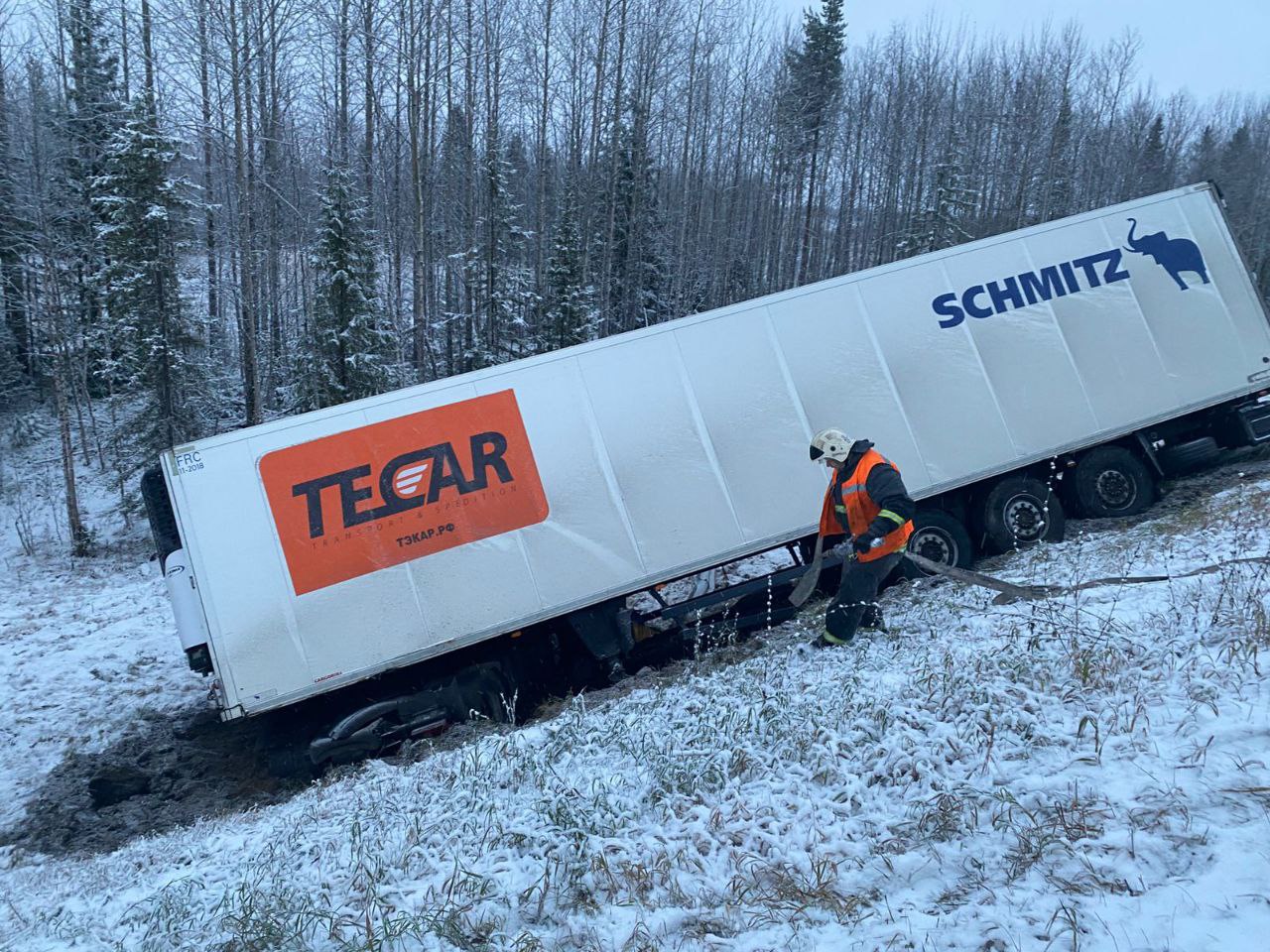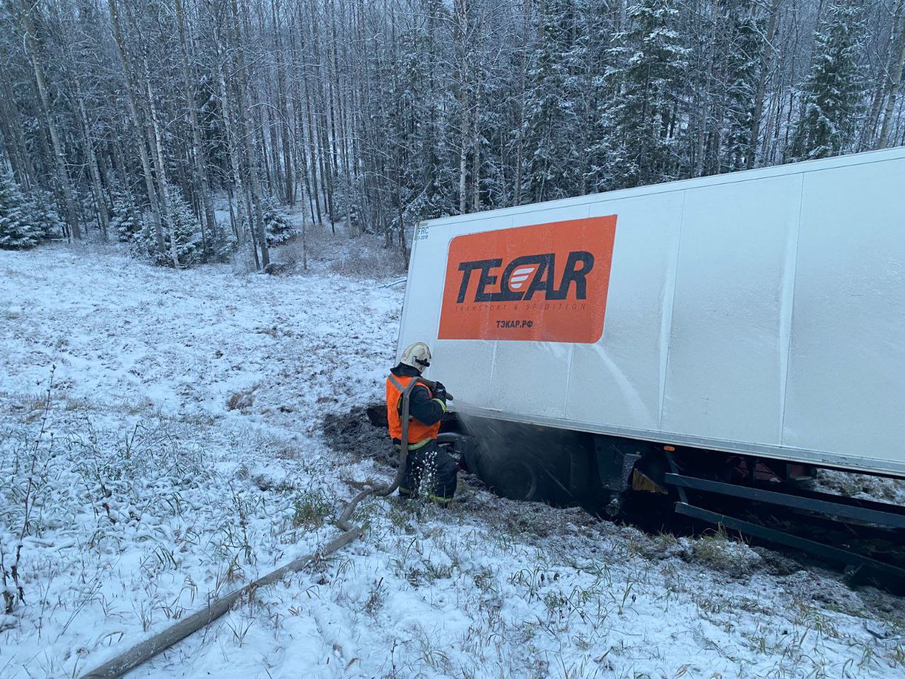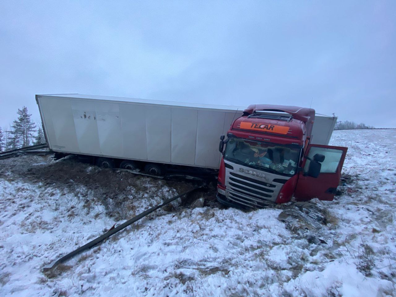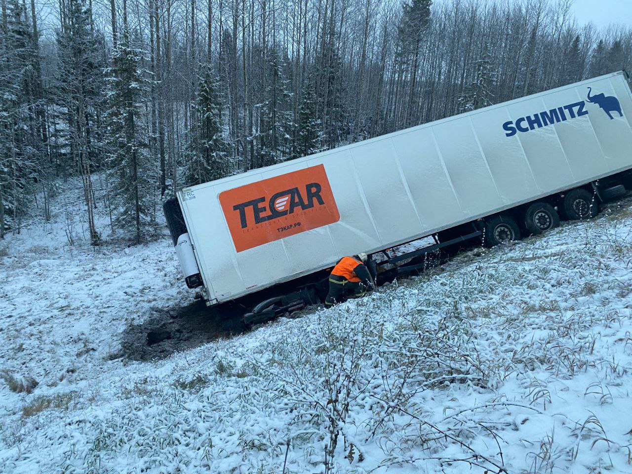 На 853-м километре федеральной трассы Р-21 «Кола» в Кемском муниципальном округе произошло ДТП с участием грузового автомобиля. Фура съехала в кювет и оказалась под откосом.