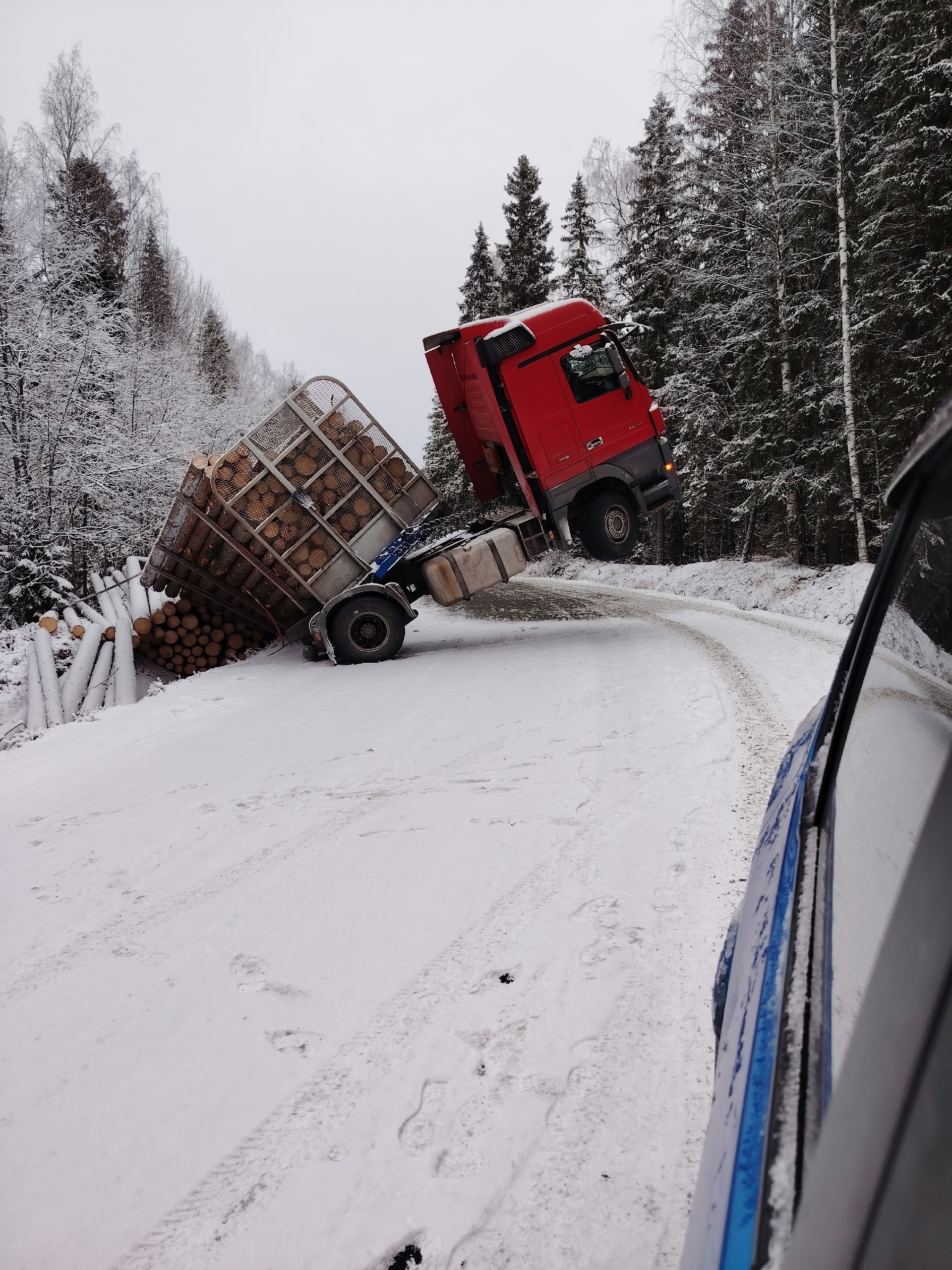 ДТП произошло на 8 километре дороги от Кинелахты в сторону Ведлозера. Там лесовоз завалился в кювет и заблокировал дорогу в Пряжинском районе. Завалившийся грузовоз кабиной навис над дорогой и перекрыл проезд.