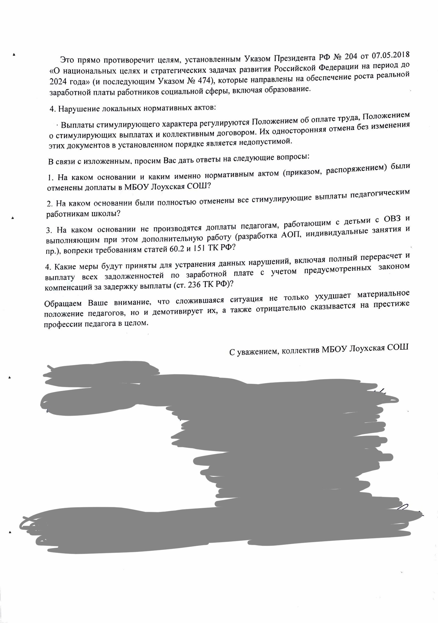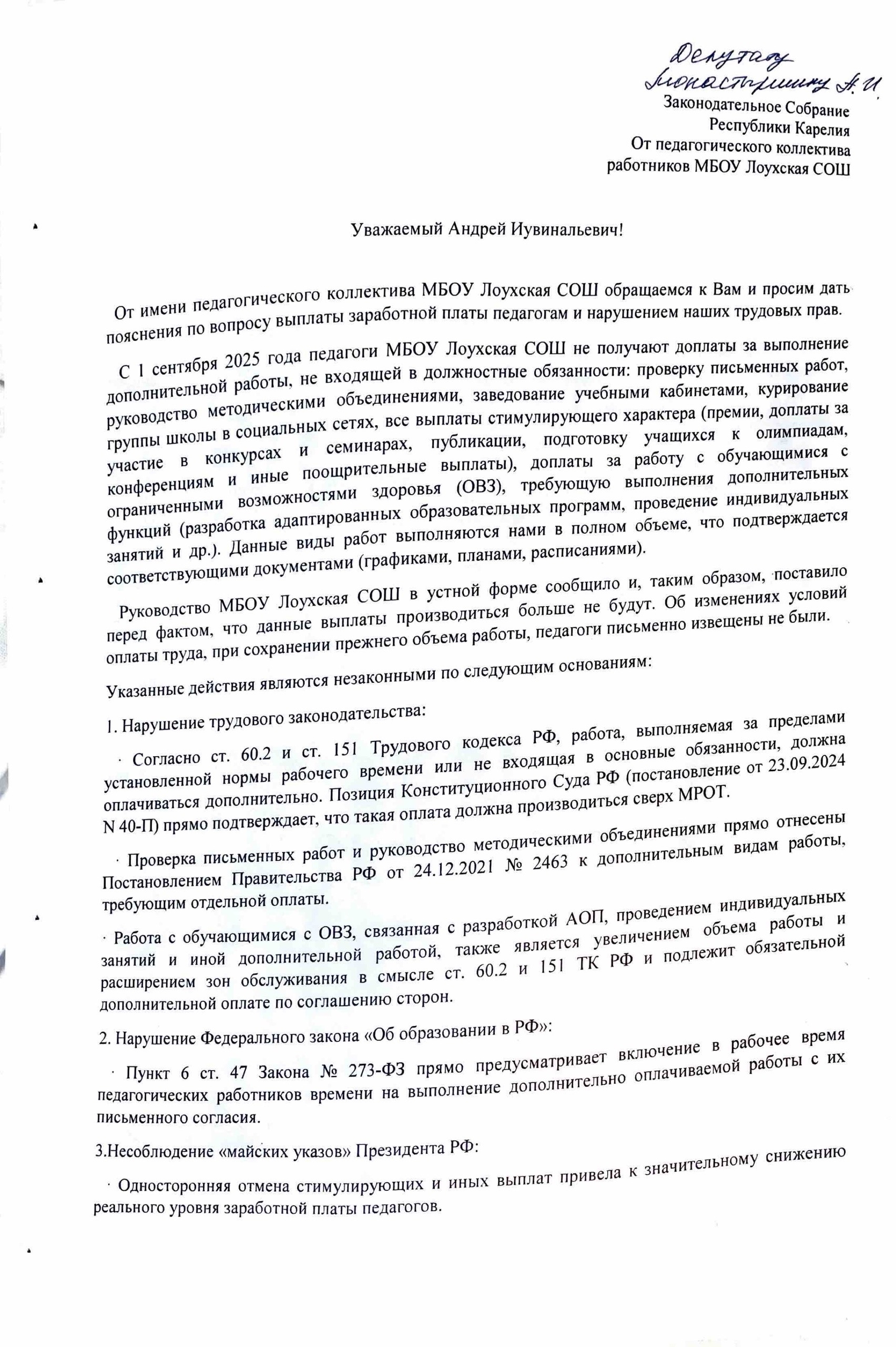 «Получено коллективное обращение от педагогов МБОУ Лоухская СОШ по вопросу отмены стимулирующих выплат, оплаты за дополнительные трудовые функции и других нарушений трудовых прав учителей. Считаю недопустимым такие действия, которые приводят к ухудшению положения педагогов и снижению уровня их заработной платы. В связи с этим обратился к прокурору Республики Карелия Дмитрию Харченкову с просьбой провести проверку по изложенным фактам и принять меры прокурорского реагирования при подтверждении нарушения законодательства РФ», — сообщил Андрей Монастыршин.