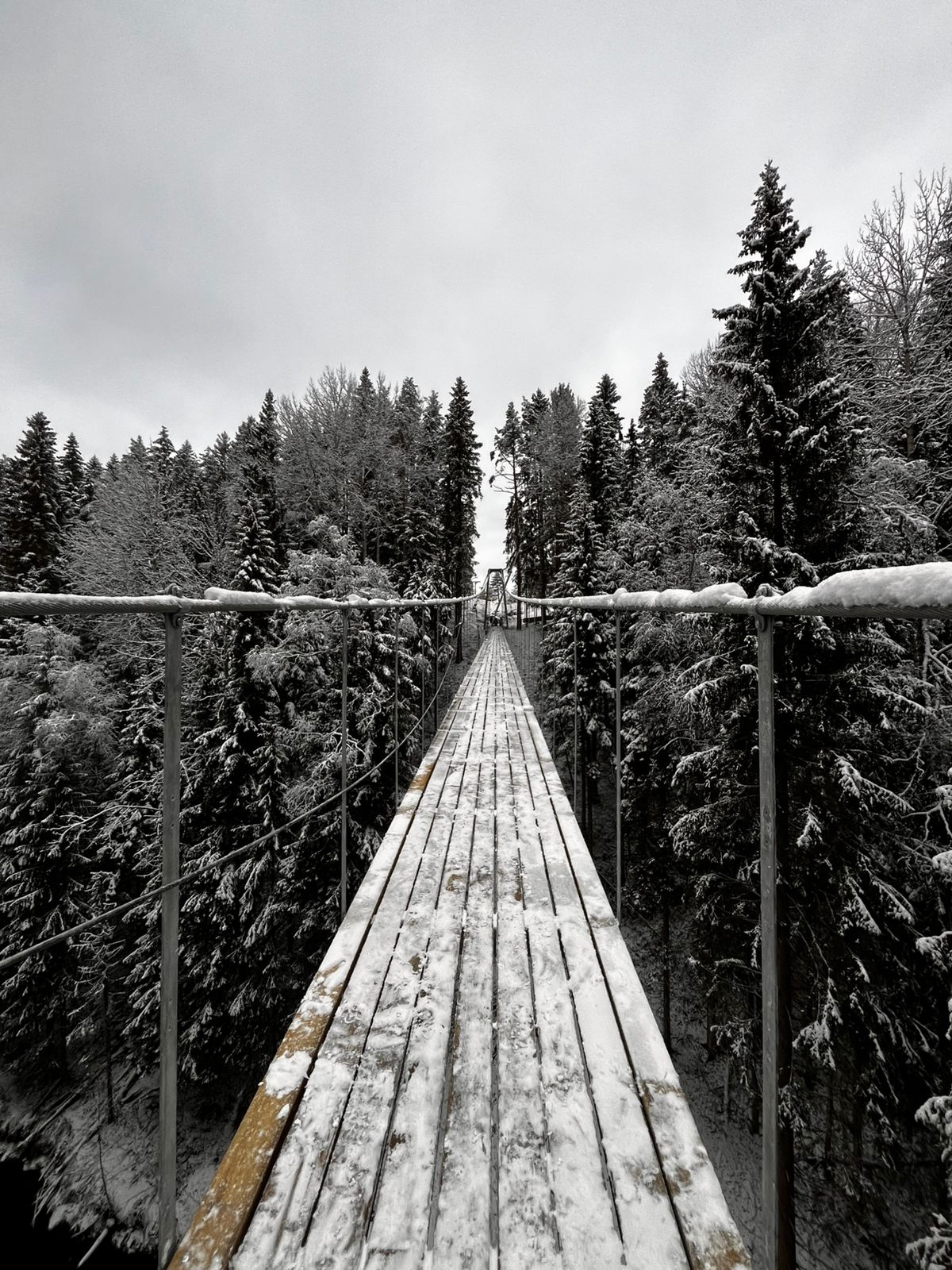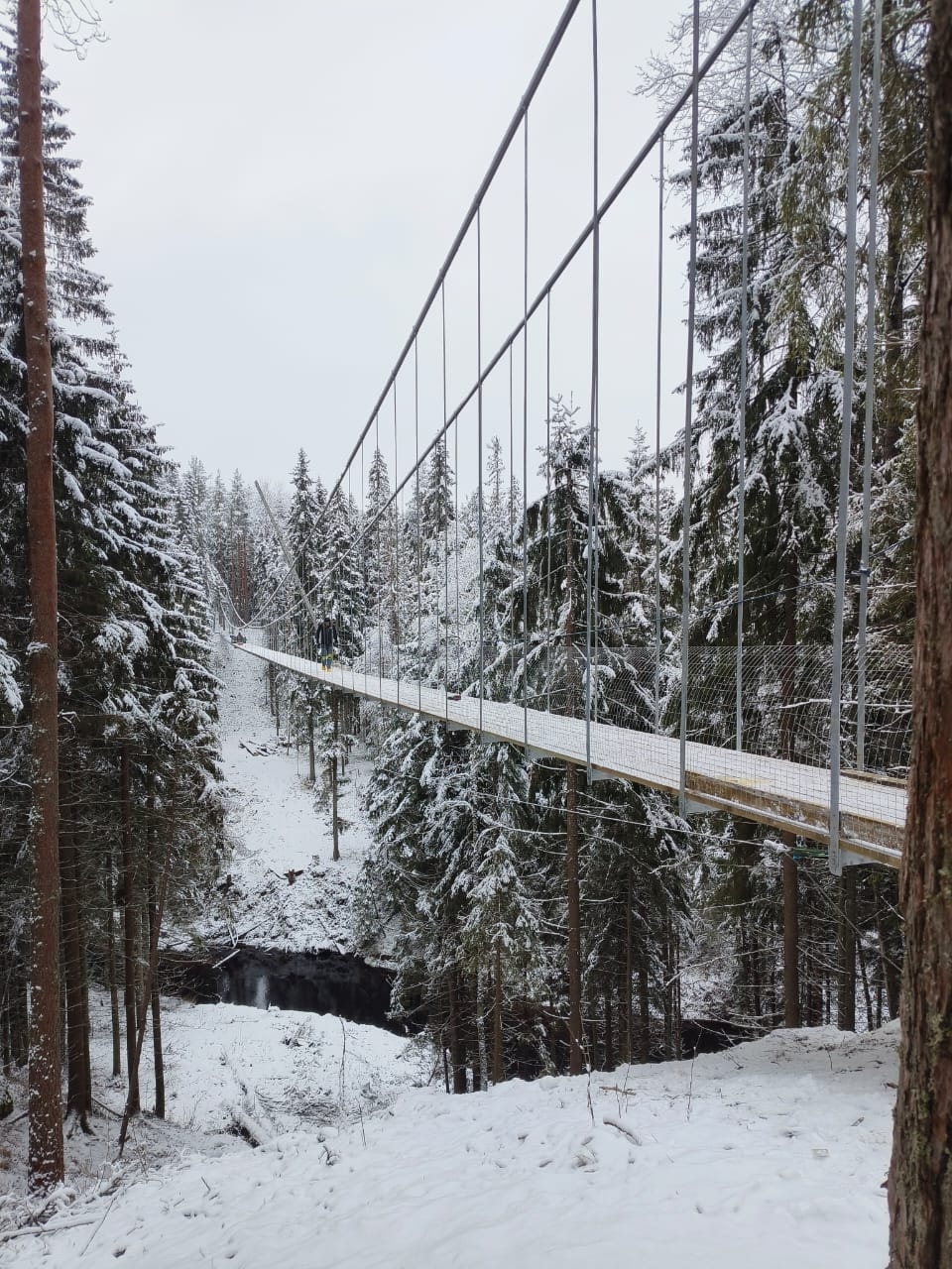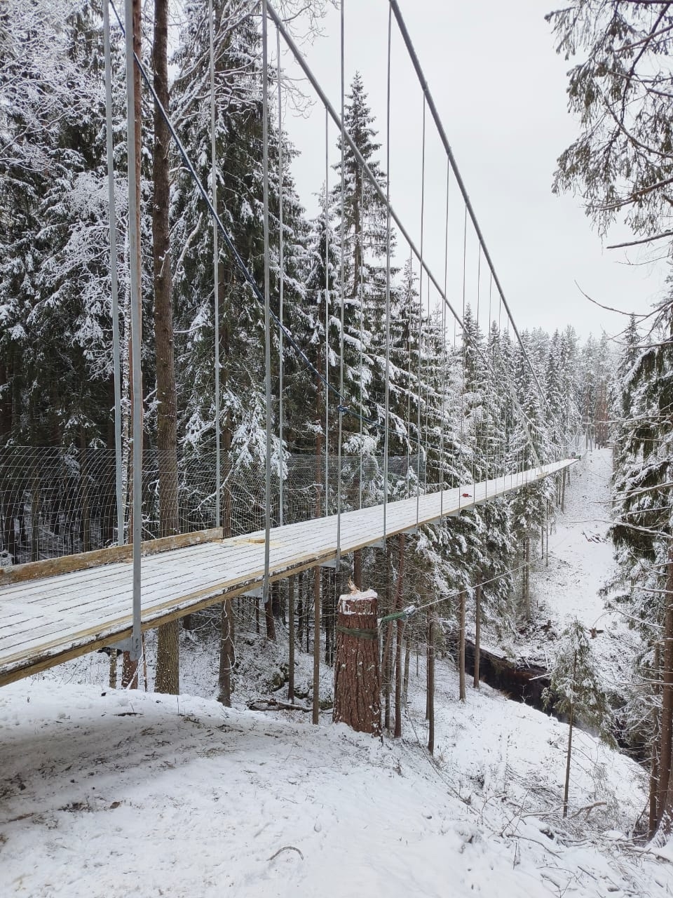 Длина подвесного моста составляет 150 метров, а высота — 25 метров. Он находится в этнопарке «Долина водопадов» в Лахденпохском районе.