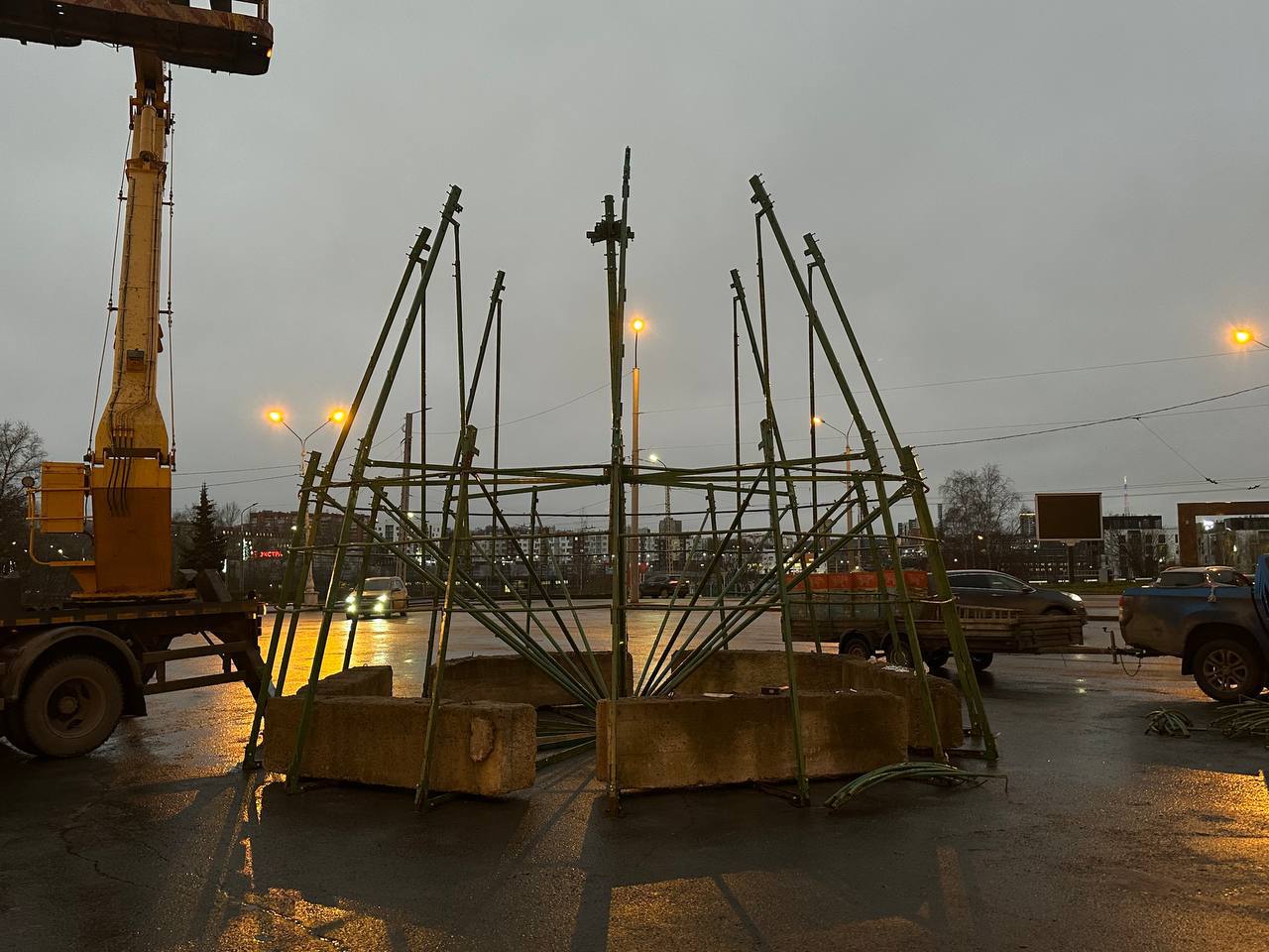 Рабочие приступили к монтажу каркасной ели высотой 18 метров на площади Кирова. Об этом в своем блоге сообщила мэр карельской столицы Инна Колыхматова.