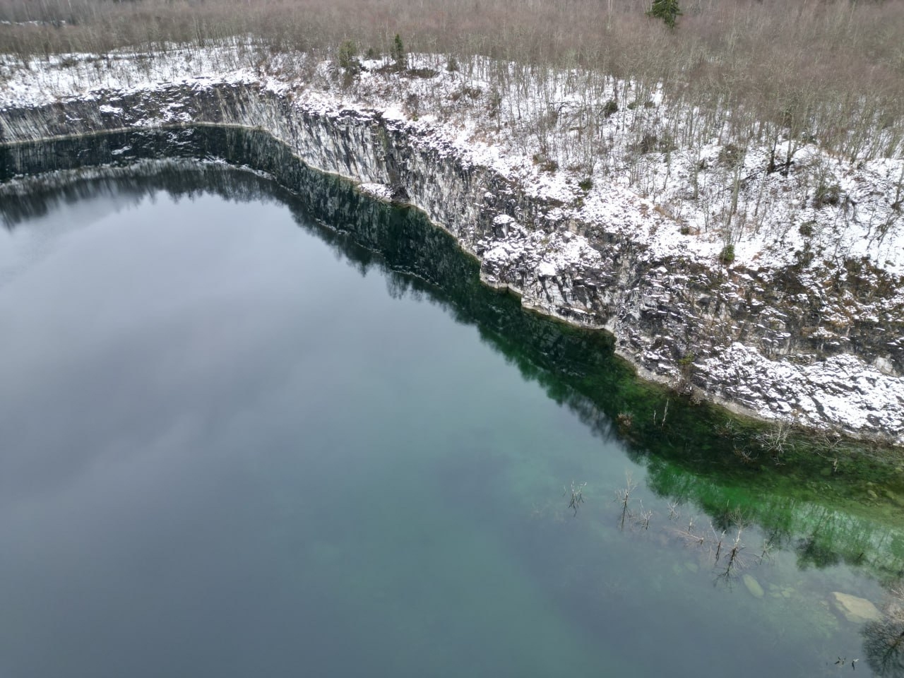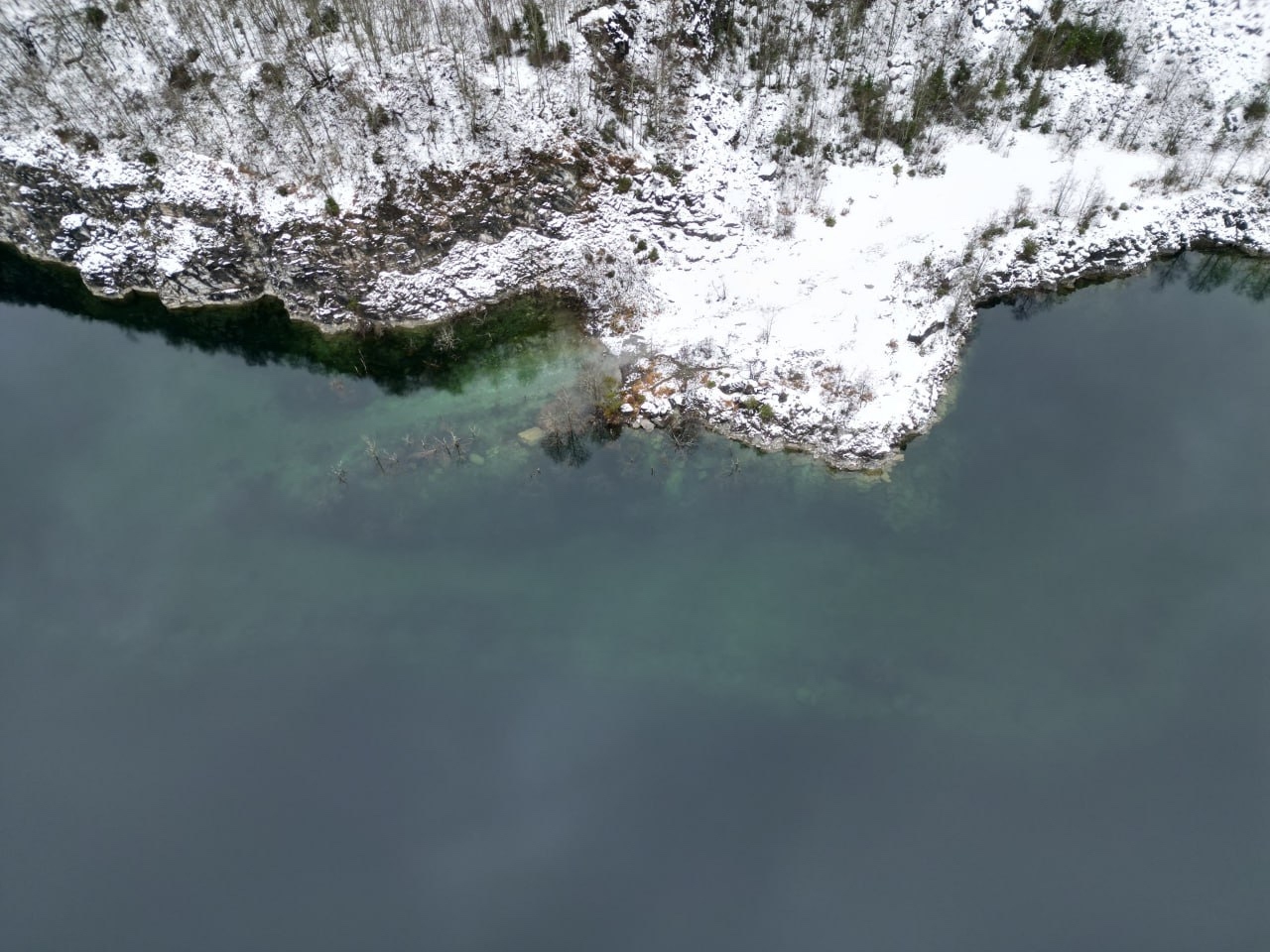 Породы покрылись снегом и напоминают какой-то космический ландшафт. Вода стала прозрачной и на дне видны камни и затонувшие деревья.