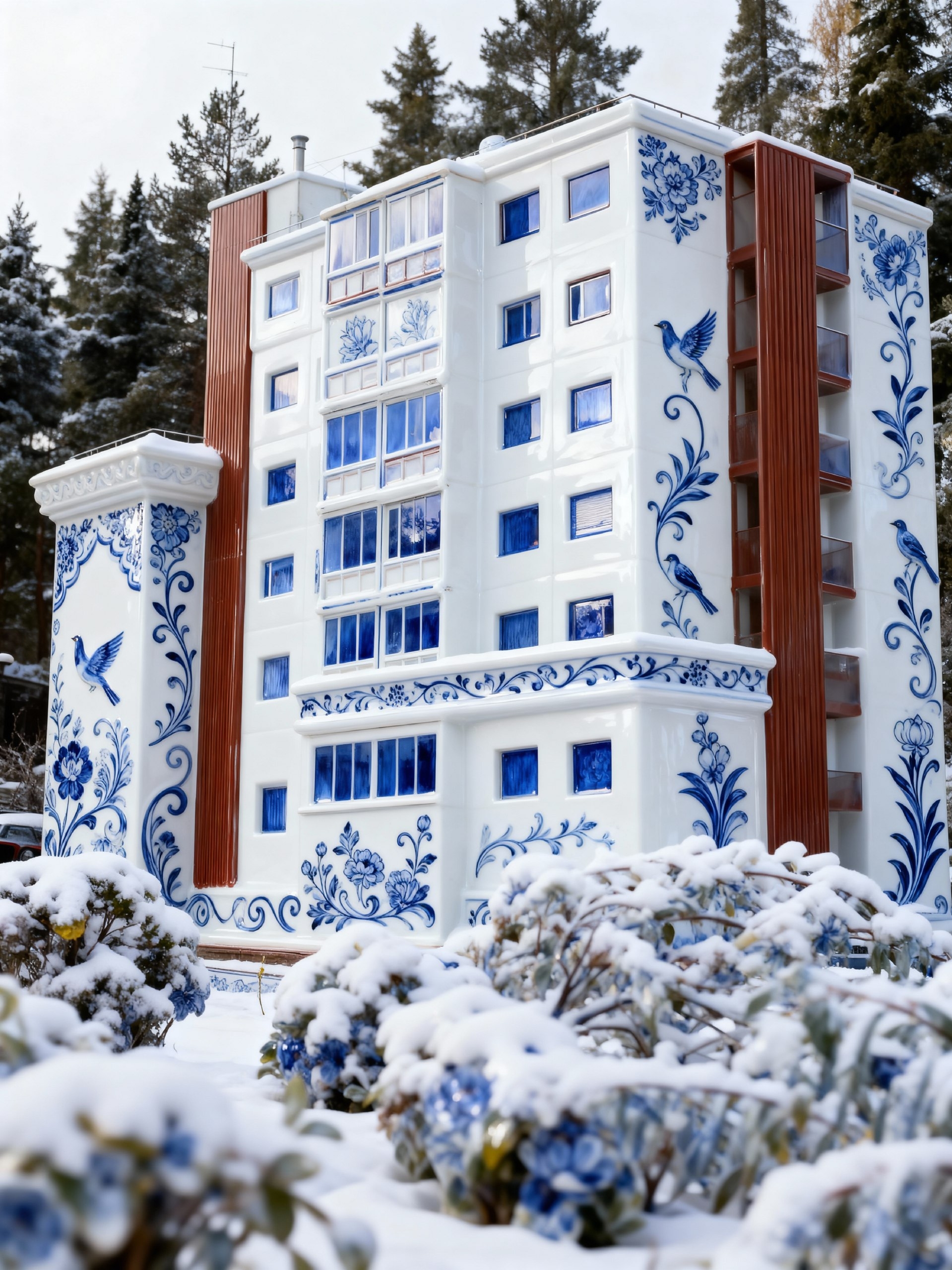 Теперь администрация предлагает увидеть город в новой художественной интерпретации. На этот раз Костомукша представлена в стиле, вдохновленном традиционной гжельской росписью. Визуализация демонстрирует, как мог бы выглядеть город в изысканной сине-белой цветовой гамме.
