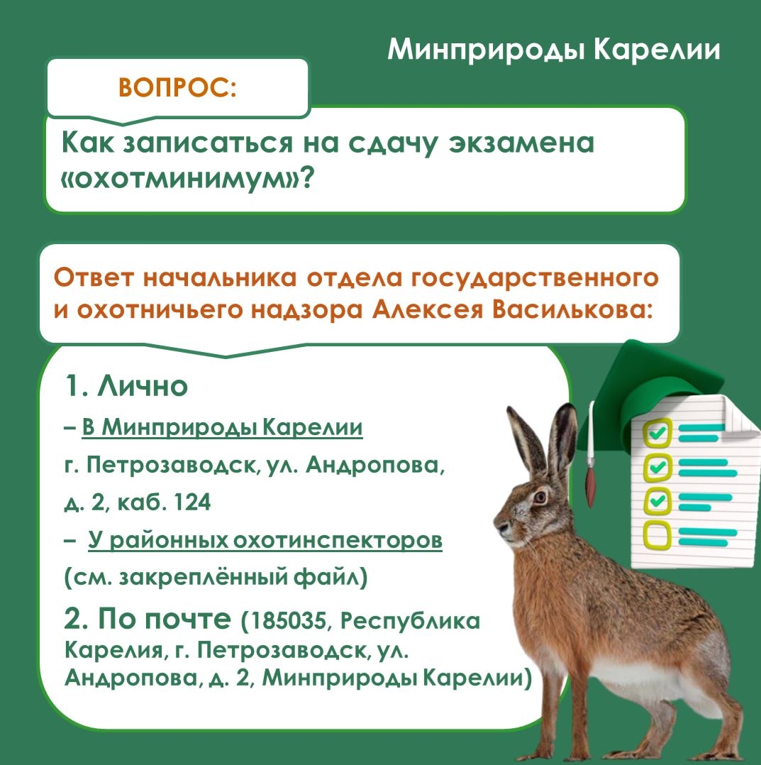 Чтобы получить охотничий билет, нужно записаться на сдачу экзамена по «охотминимуму». Для этого необходимо лично обратиться в Минприроды Карелии на Андропова, 2, или к районным охотинспекторам, а также по почте ведомства. Об этом сообщили в Минприроды Карелии.