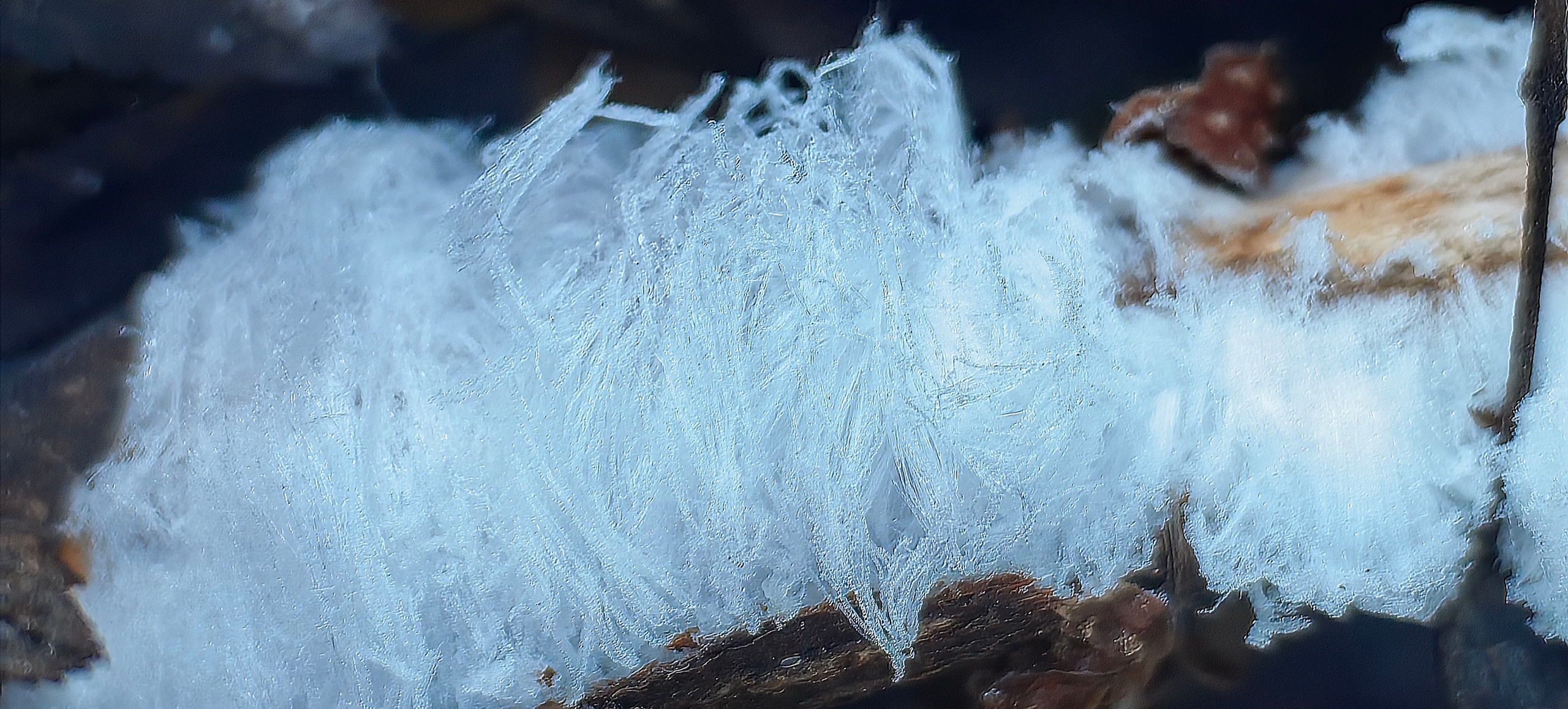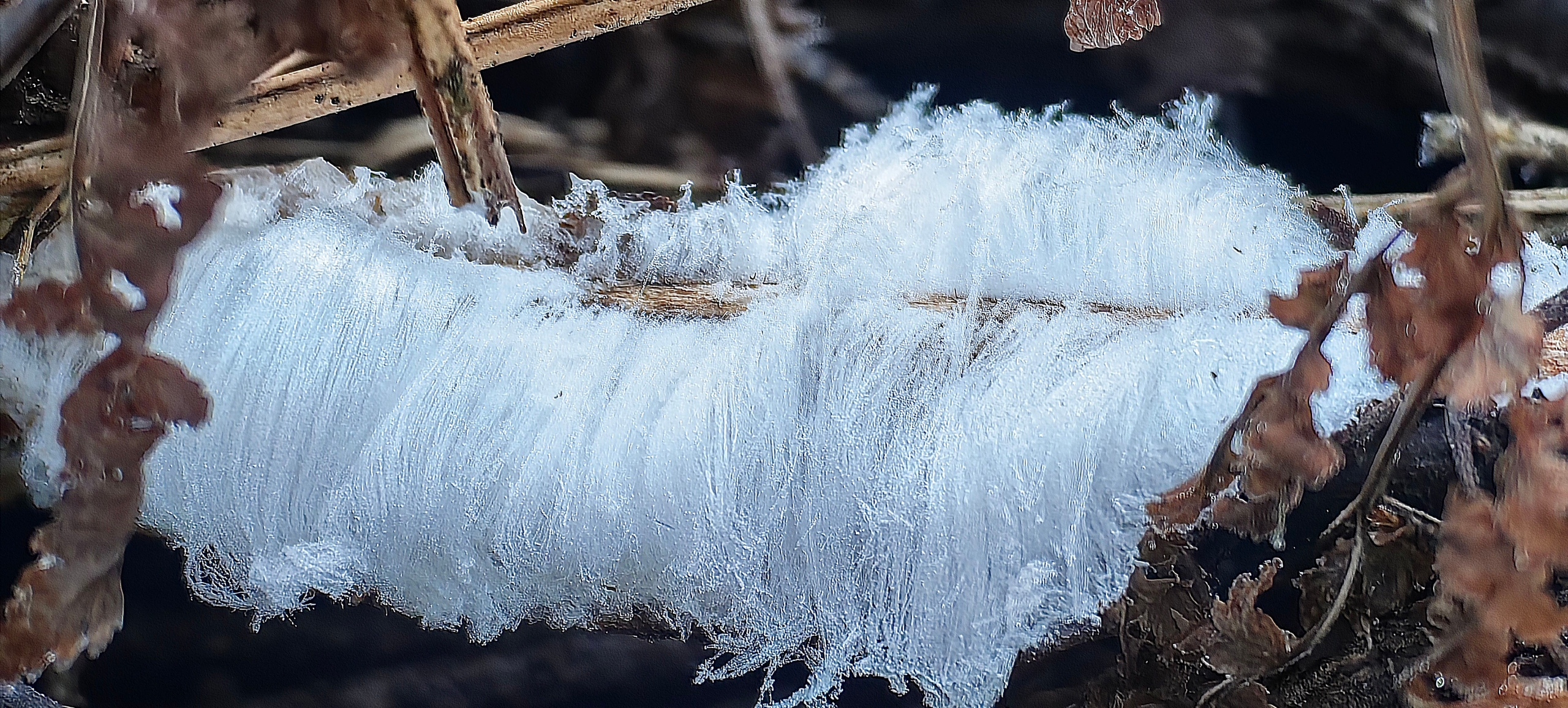Изящная архитектура ледяных волос напоминает также шерсть. Размер отдельных «волосков» начинается от пяти сантиметров, но при благоприятных условиях они могут достигать целых 20 сантиметров и виться как при искусной укладке.