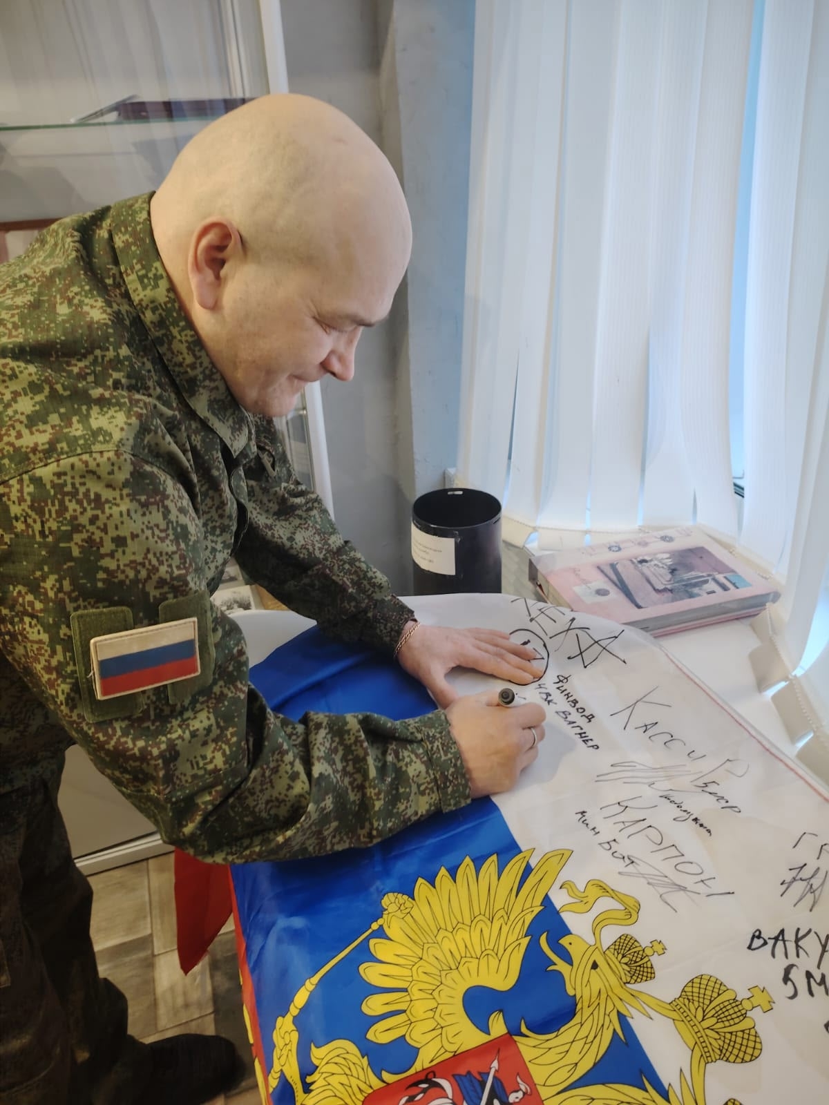Новые предметы для экспозиции при Центре внешкольной работы передал из рук в руки костомукшанин, герой СВО Александр, прибывший в отпуск. Он привёз личные элементы экипировки: бронежилет 3-го класса весом около 15 кг и каску со следами от пуль, а также шеврон с символикой «Z».