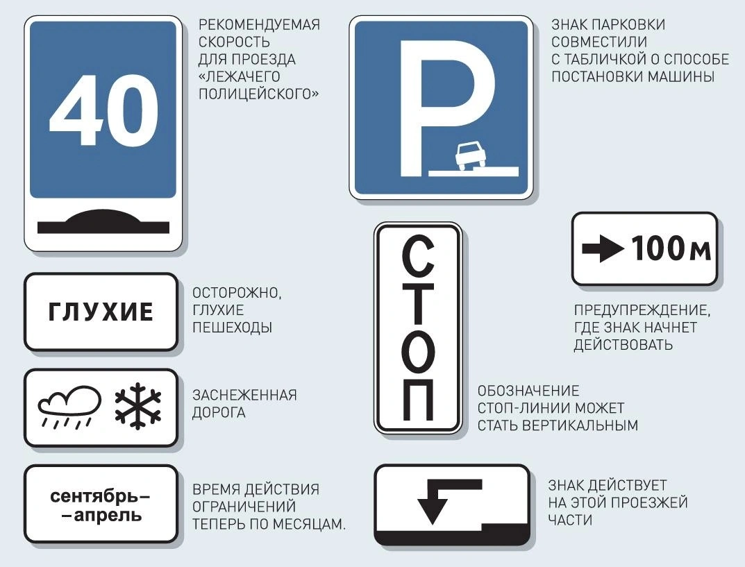 Обновлена табличка, которая указывает срок действия различных дорожных знаков, например, конкретные часы или даже дни недели. Теперь в этот список попали и месяцы, если, например, вводятся сезонные ограничения для проезда большегрузов весной.