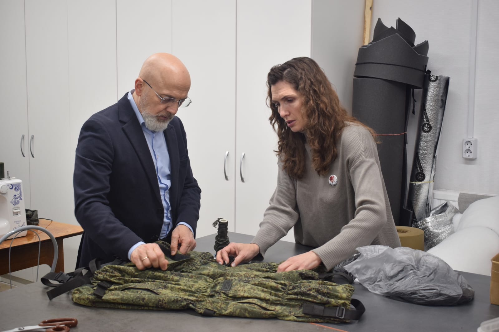 Особым пунктом визита стало посещение волонтерского центра «10 регион». Его участники плетут маскировочные сети, шьют одежду и обмундирование, а также производят сублимированную еду для бойцов. Руководитель волонтерского движения Елена Зезюльчик провела экскурсию и рассказала о деятельности добровольцев и о центре, где можно также обратиться к представителю государственного фонда «Защитники Отечества».
