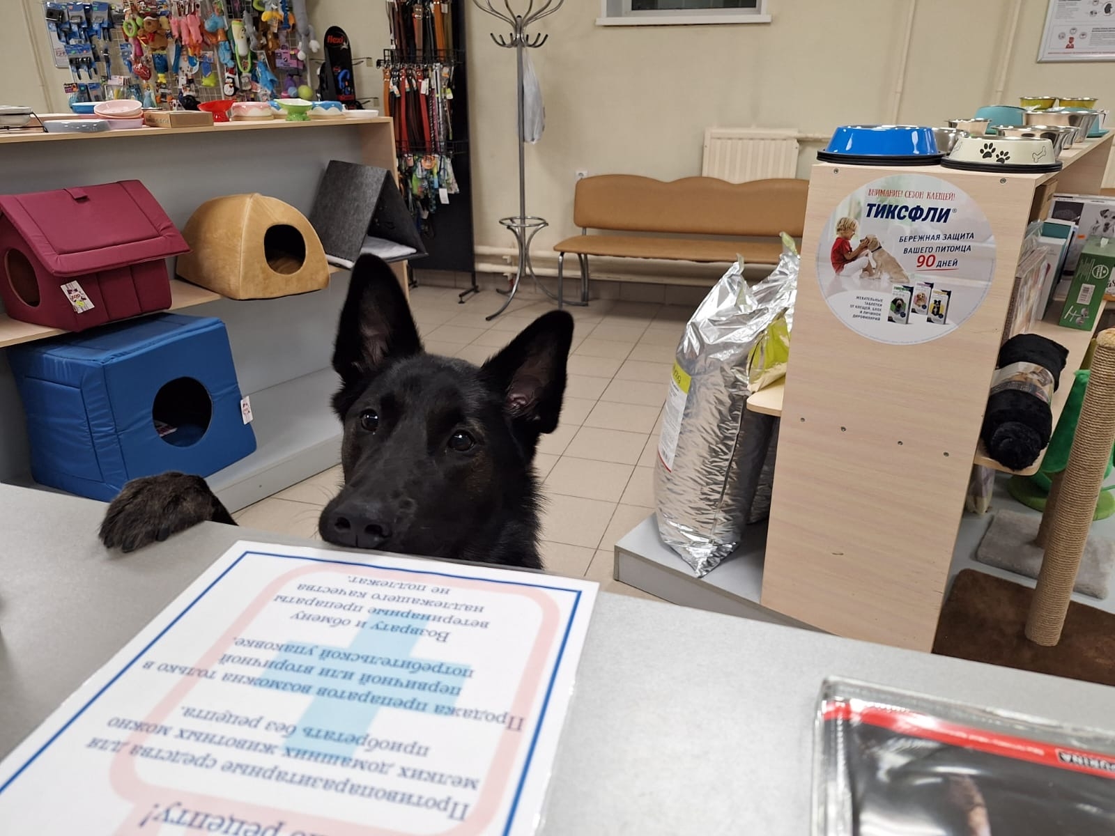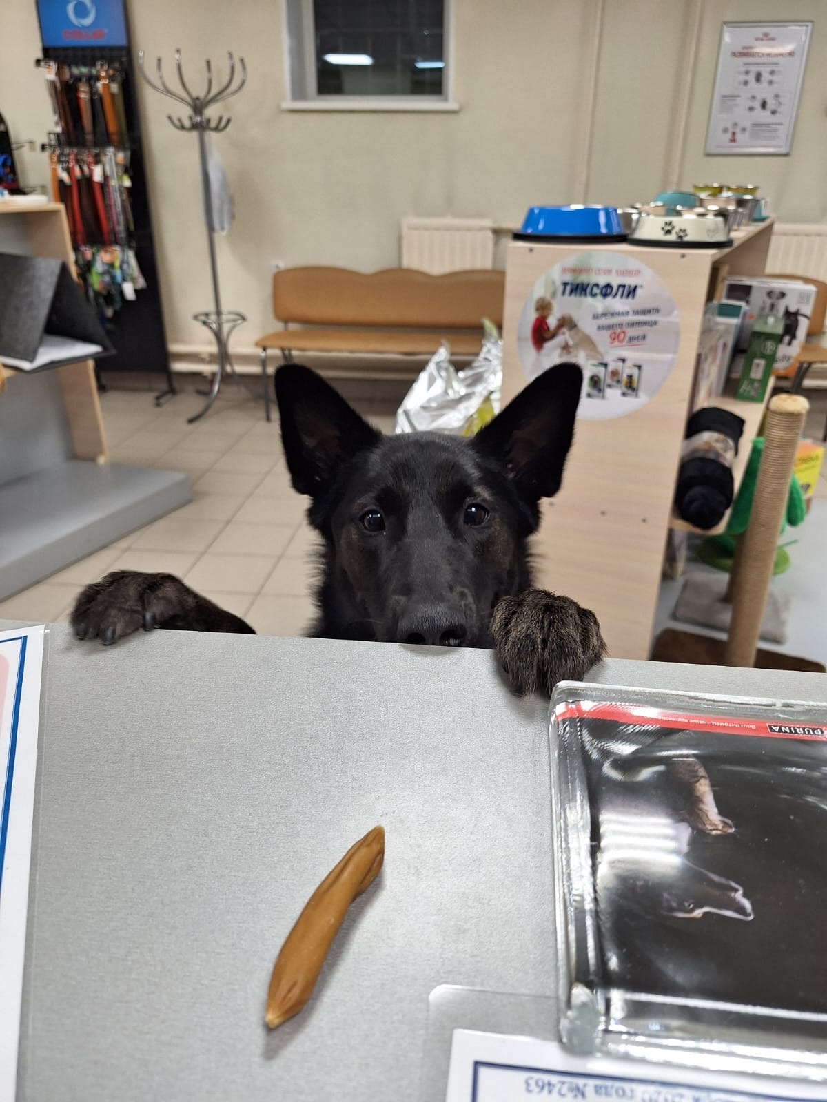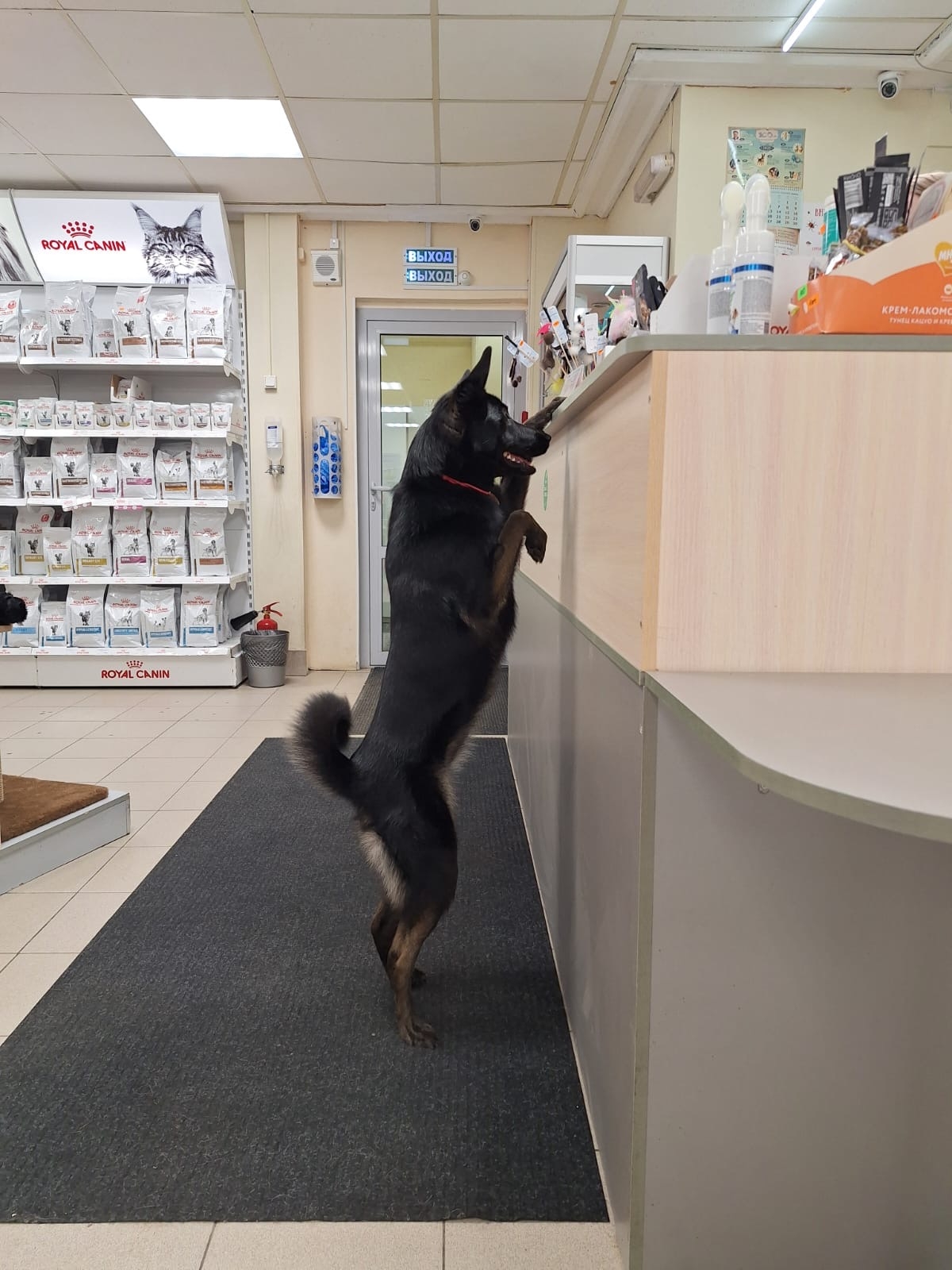 На кадрах — симпатичная брюнетка-собачуля встала на задние лапы у стойки администратора явно в ожидании лакомства.