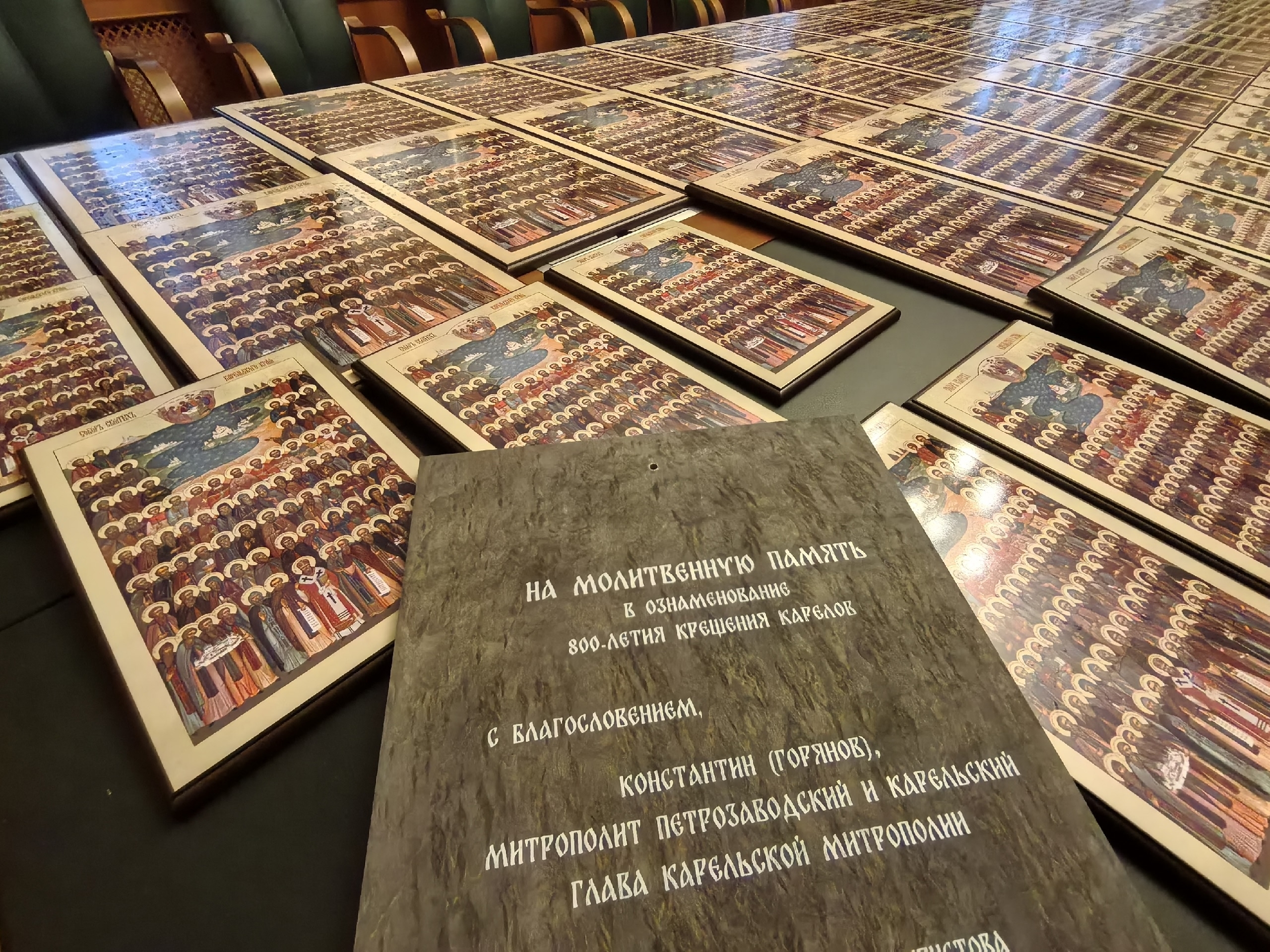 Эти иконы созданы к 800-летию Крещения карелов. На каждом образе изображены лики 80 святых, чья жизнь и подвиги связаны с карельской землей. По благословению митрополита Константина все освященные иконы будут безвозмездно переданы в каждый храм и монастырь епархии, где проводятся регулярные службы.